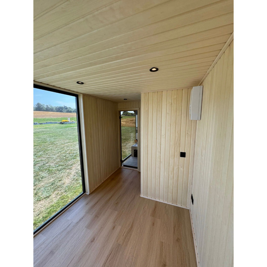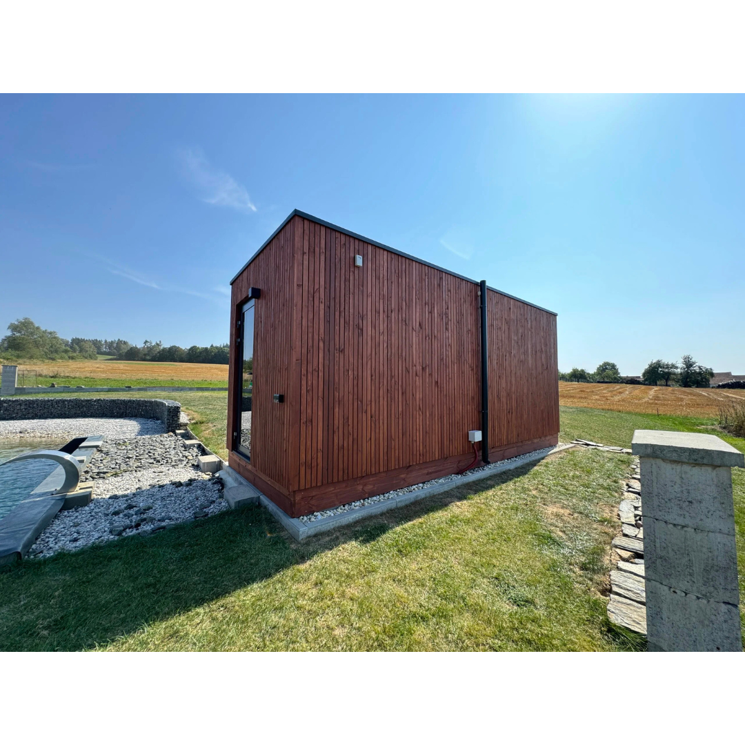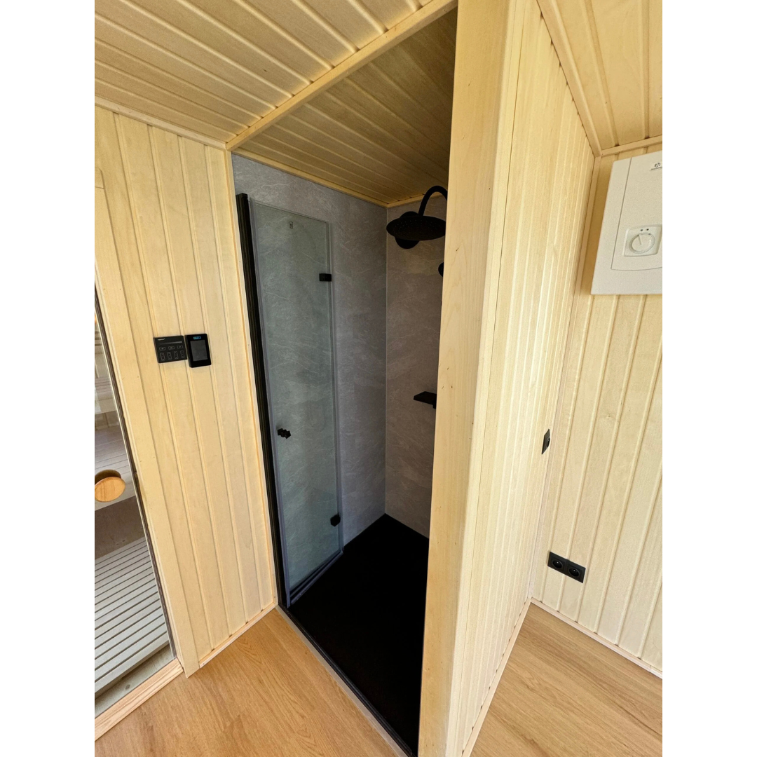 Erweiterter Vorraum mit PanoramafensterDas Modell AIVA zeichnet sich durch einen vergrößerten Vorraum aus, der mit einem großen Panoramafenster ausgestattet ist. Der zusätzliche Platz eignet sich perfekt für die Installation einer Dusche oder das Aufstellen von zwei Liegestühlen – ein idealer Ort zur Erholung nach dem Saunagang.
