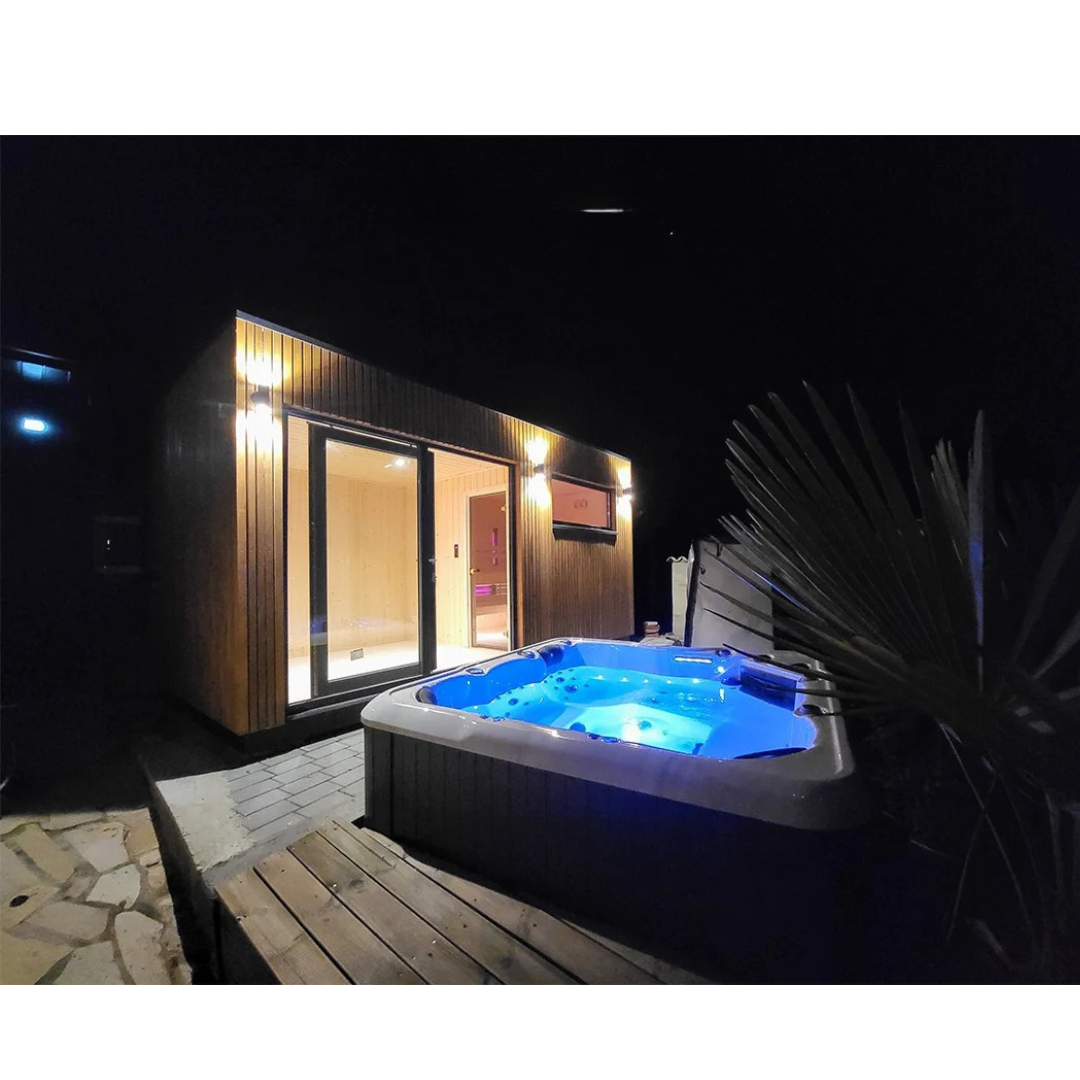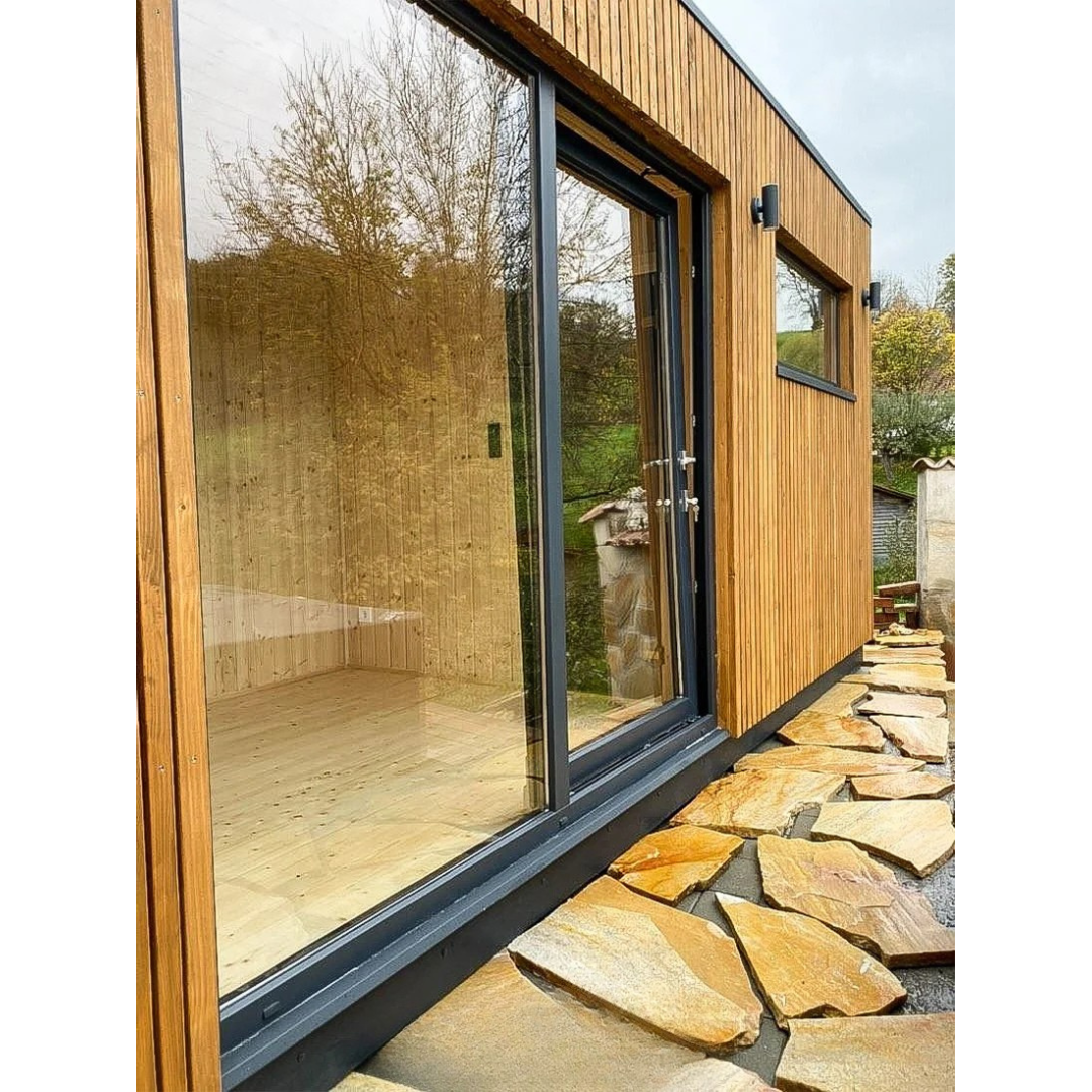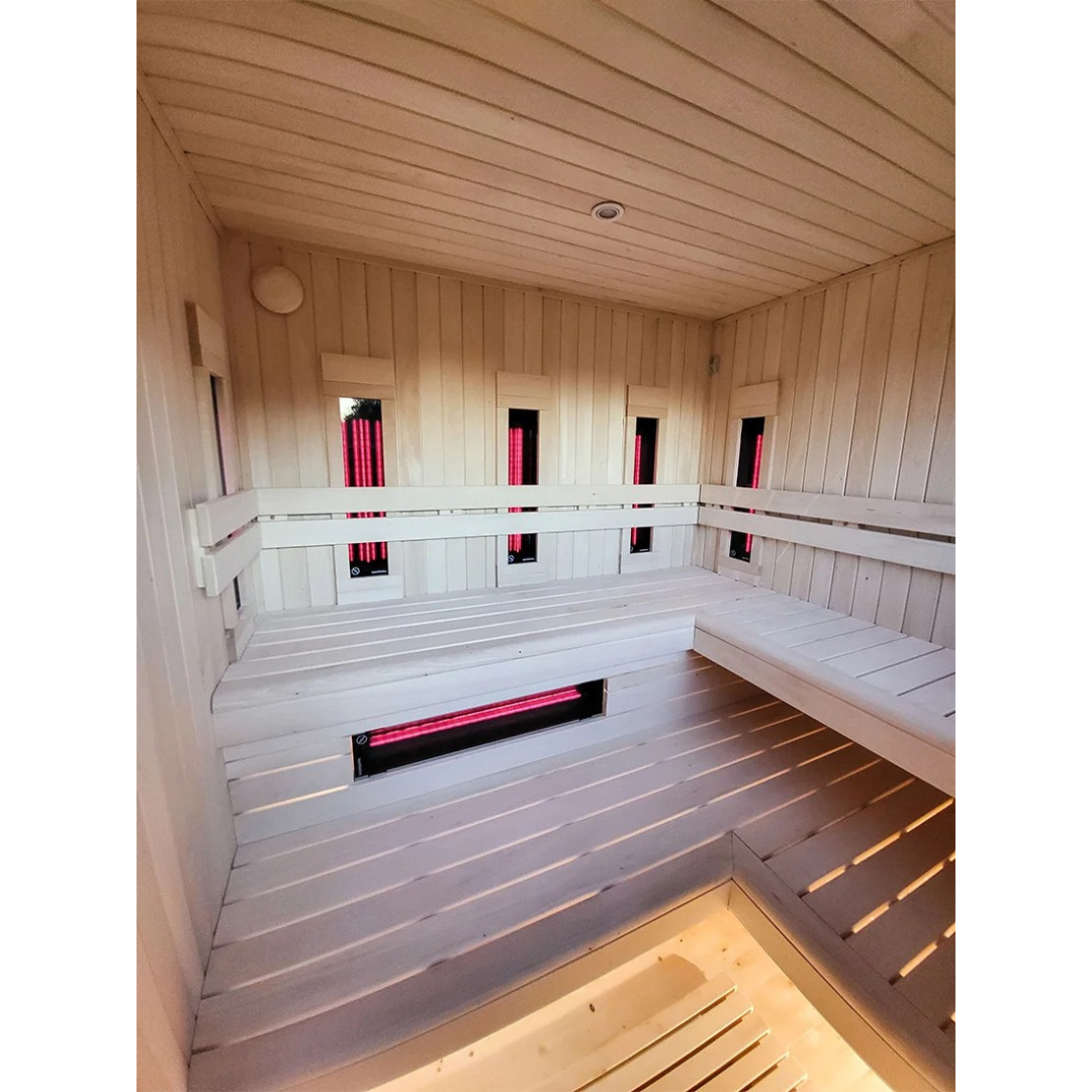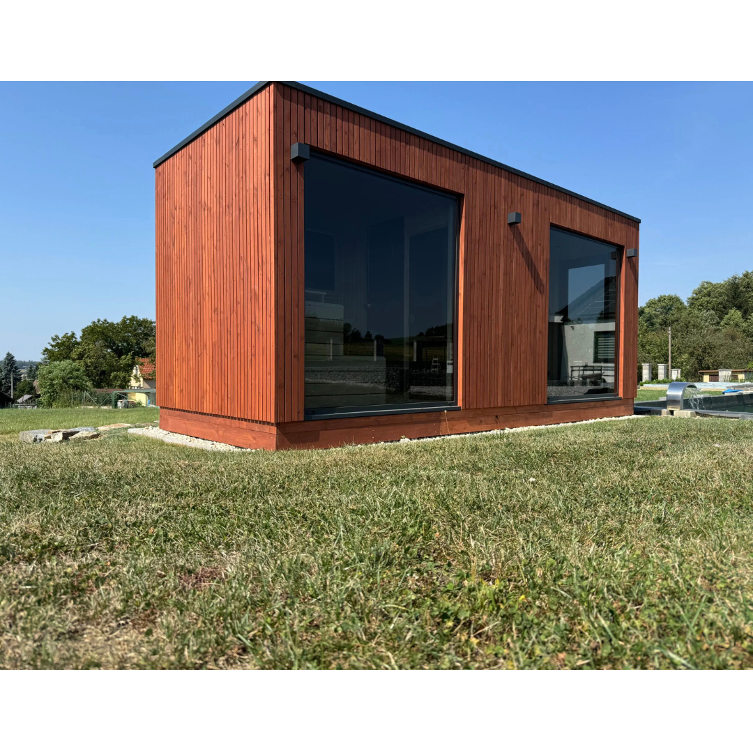 Erweiterter Vorraum mit PanoramafensterDas Modell AIVA zeichnet sich durch einen vergrößerten Vorraum aus, der mit einem großen Panoramafenster ausgestattet ist. Der zusätzliche Platz eignet sich perfekt für die Installation einer Dusche oder das Aufstellen von zwei Liegestühlen – ein idealer Ort zur Erholung nach dem Saunagang.