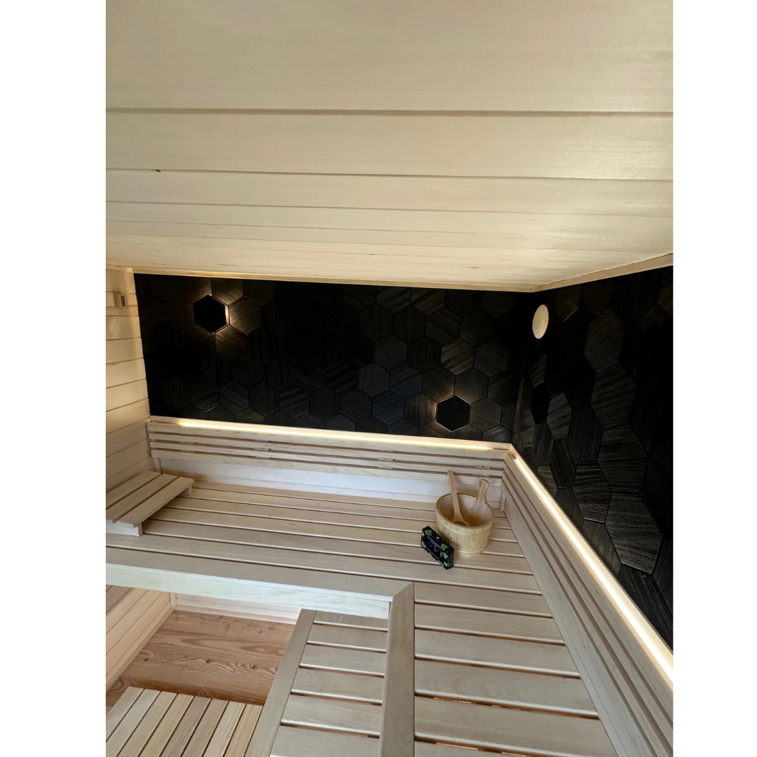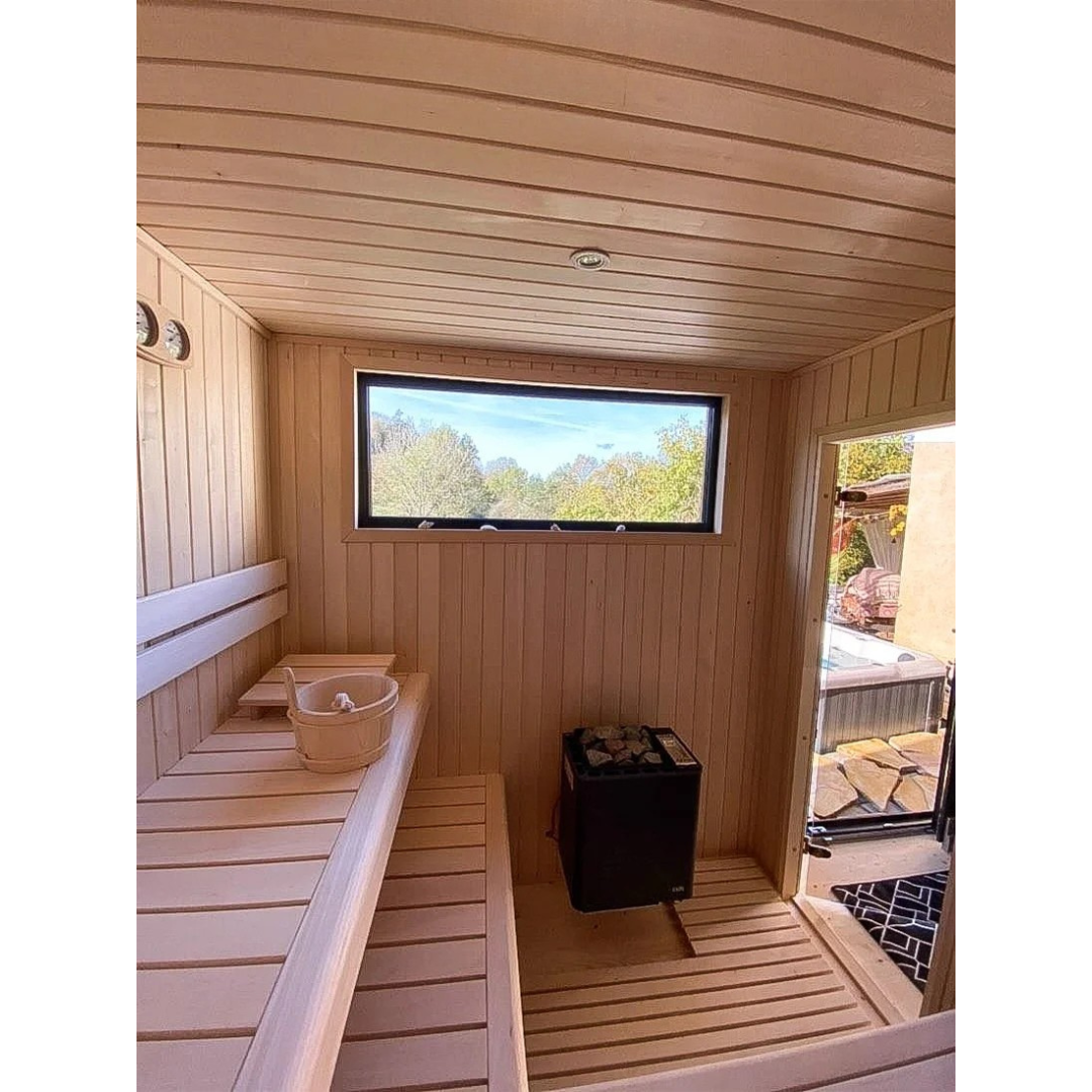 Geräumiger SaunainnenraumDas Innere der Sauna AIVA ist großzügig und offen gestaltet. Ausgestattet mit einem klassischen Banklayout – unterer und oberer Liegebank aus hochwertigem Lindenholz der Klasse AA – bietet sie komfortable Entspannung sowohl im Sitzen als auch im Liegen. Das große Panoramafenster lässt viel Tageslicht in den Raum und schafft eine angenehme, offene Atmosphäre mit Ausblick auf die Umgebung.