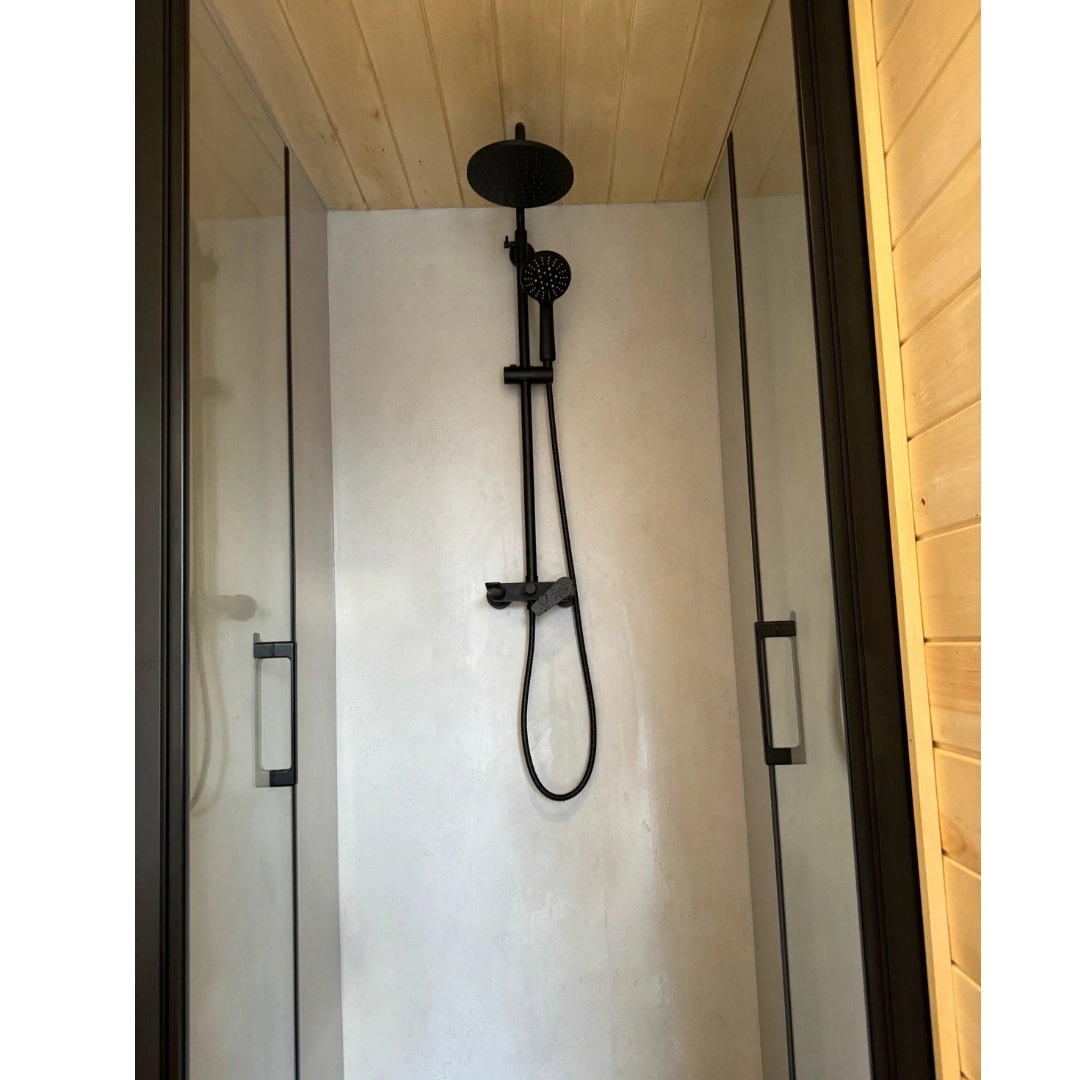 Individuell gestaltbare FassadeDie Standardfassade der AIVA-Sauna besteht aus eleganten, vertikalen Holzlamellen. Auf Wunsch kann diese durch HPL-Platten, Trapezblech oder thermisch behandeltes Holz ersetzt werden, um das Erscheinungsbild der Sauna an persönliche Vorlieben und die Umgebung anzupassen.