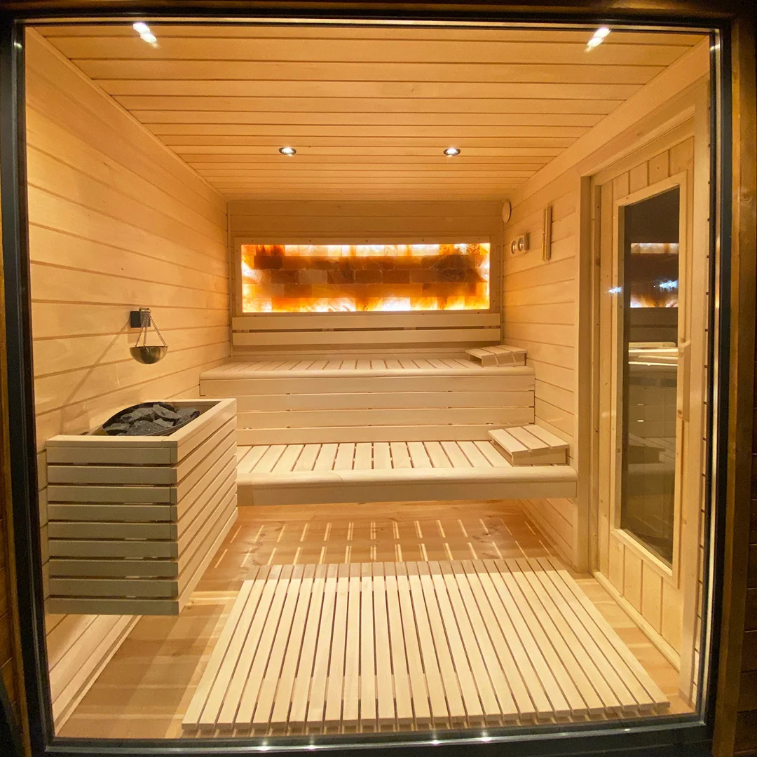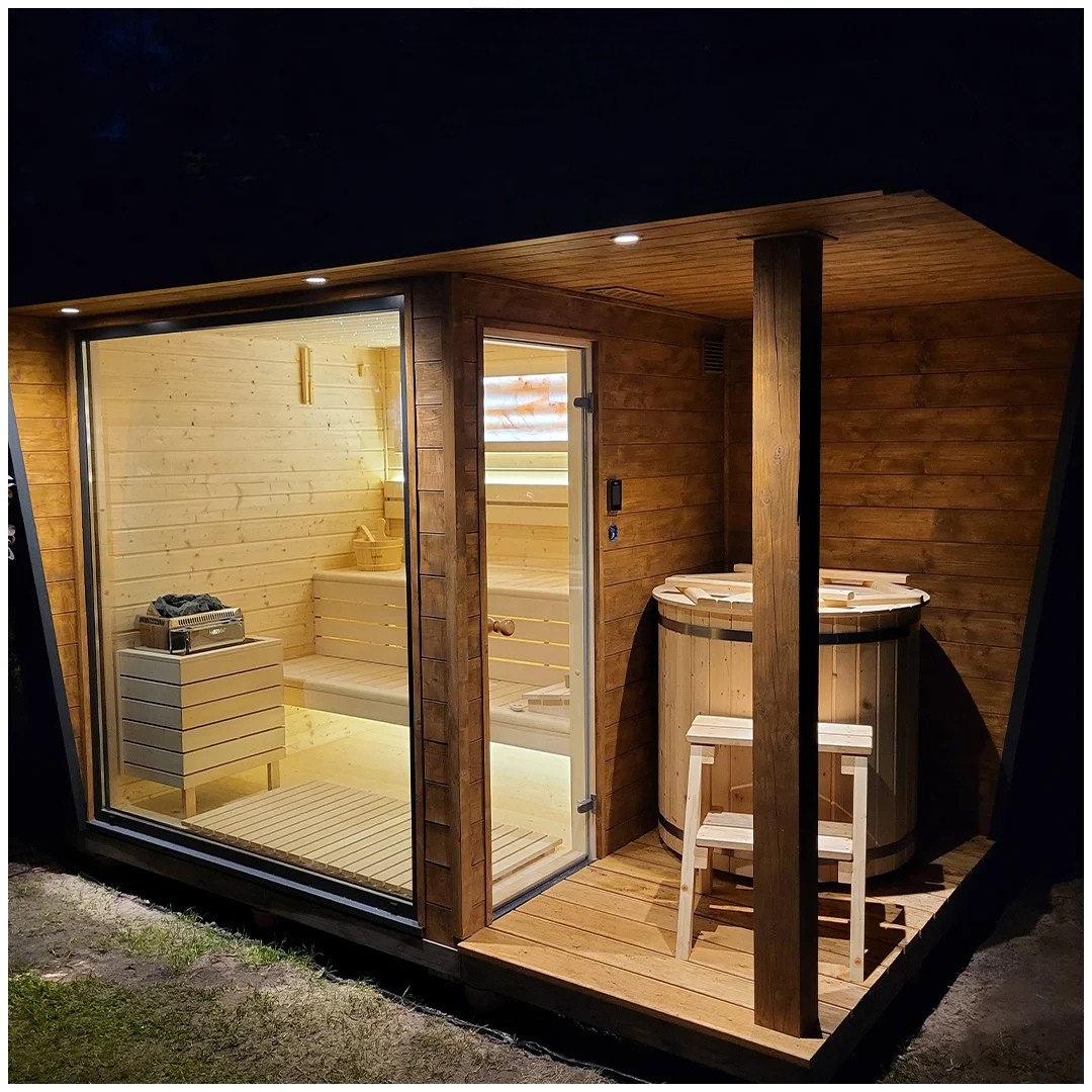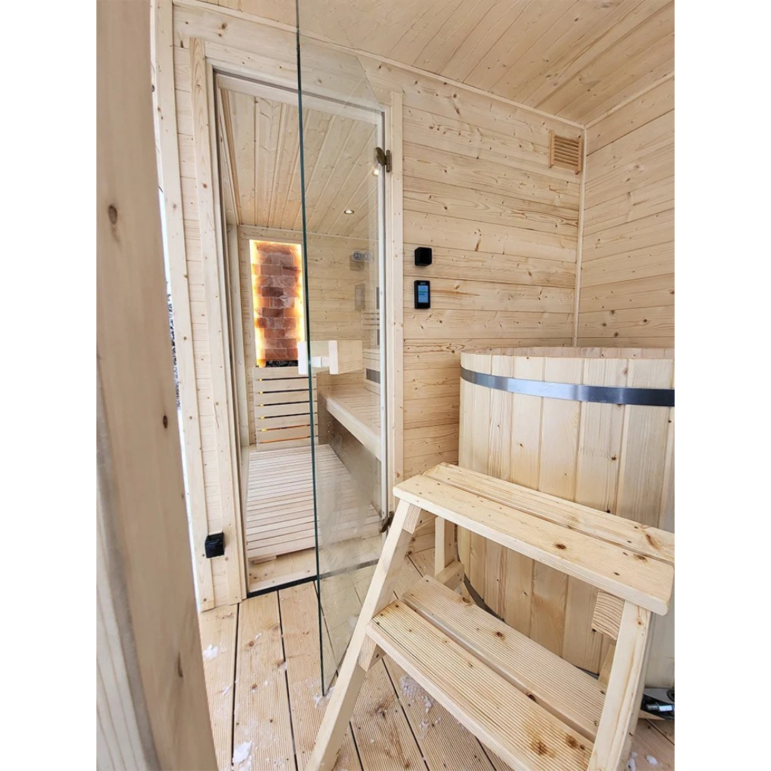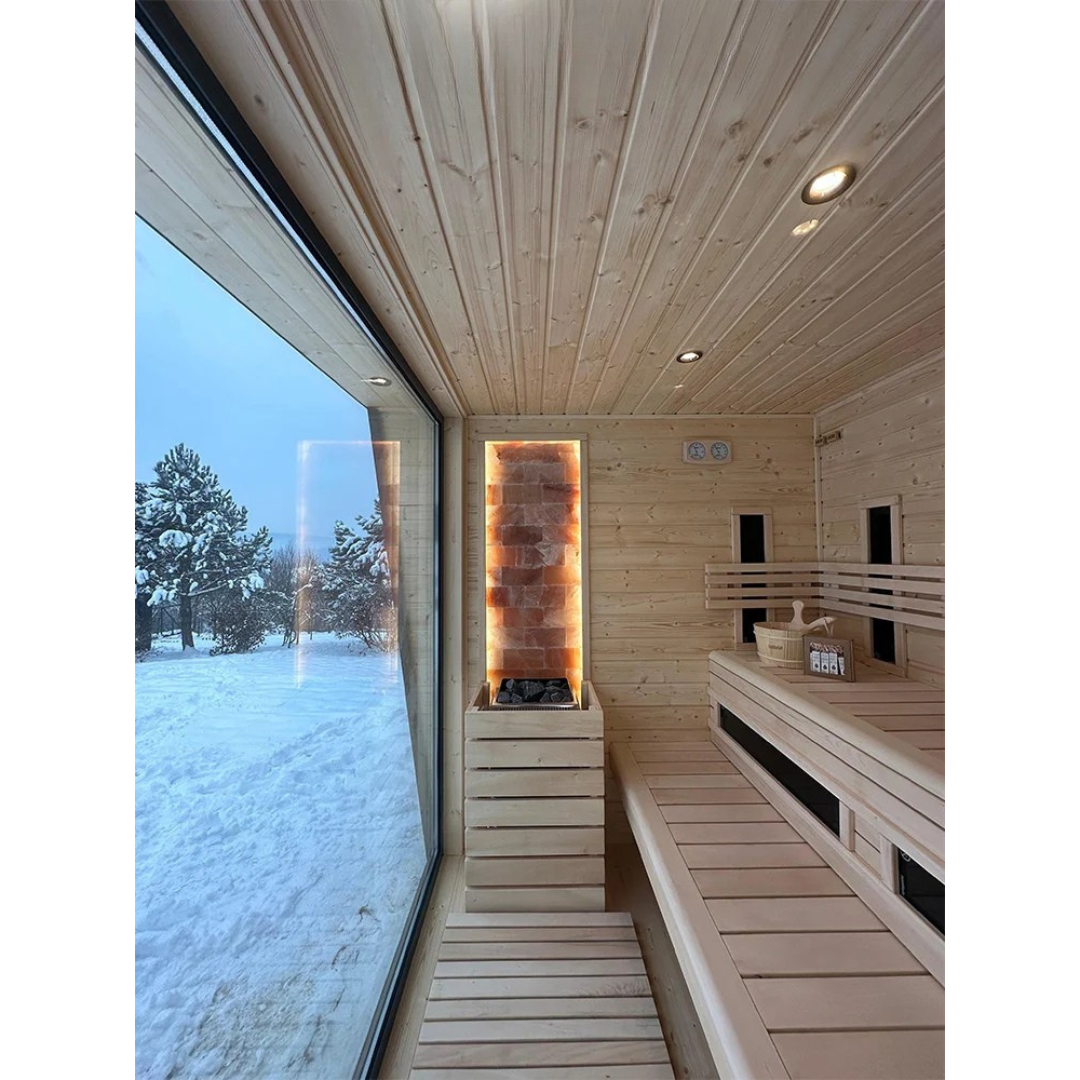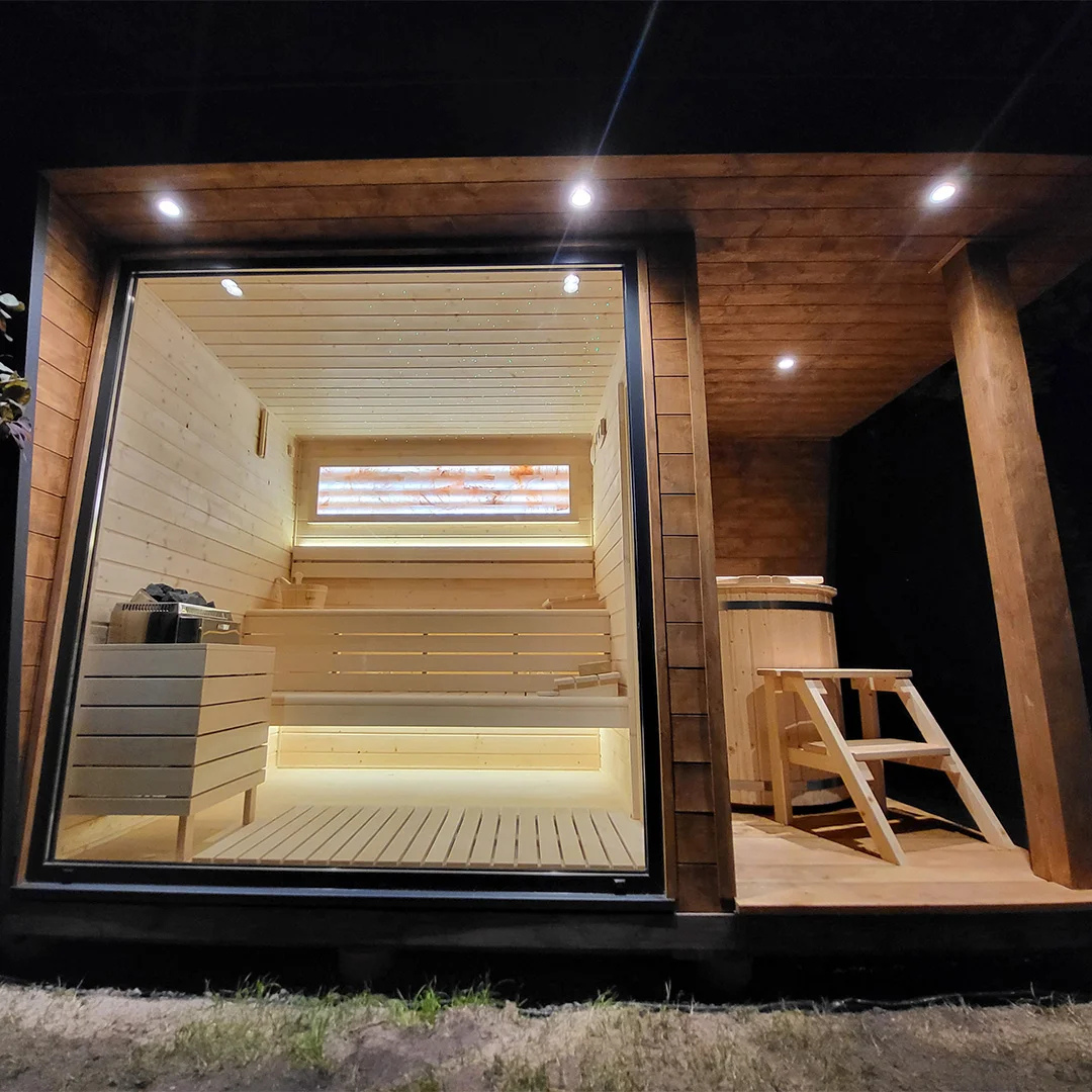 Die Dämmung besteht aus Mineralwolle mit einer Stärke von 100 mm und 150 mm sowie aus diffusionsoffener und dampfdichter Folie. Die Eingangstür in der Standardversion besteht aus Glas. Eine gehärtete Isolierglasscheibe im Aluminiumrahmen erstreckt sich über die gesamte Breite der Sauna und bietet aus jedem Bereich freien Blick nach draußen.