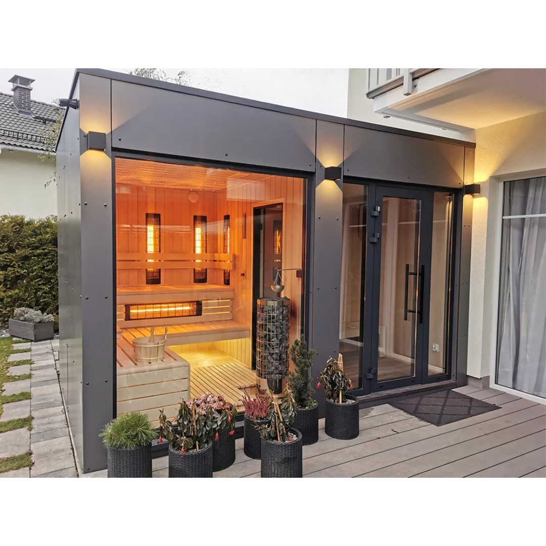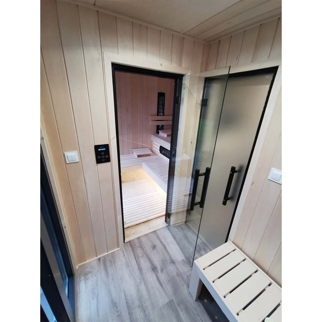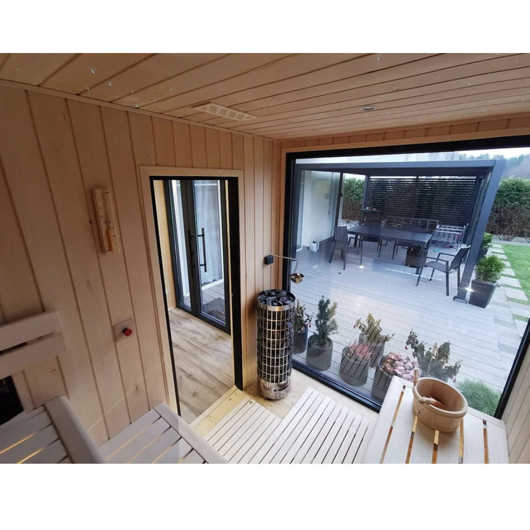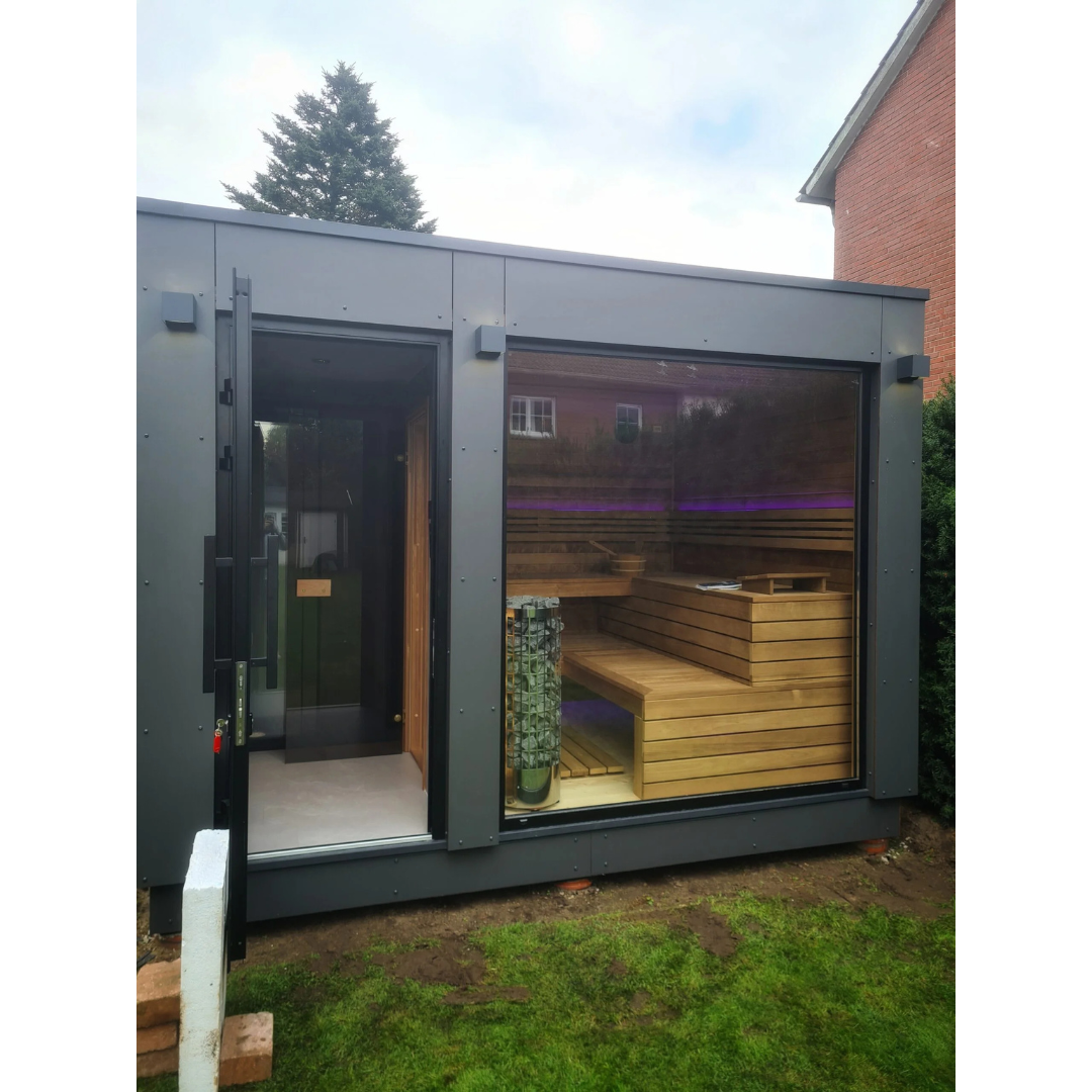 Das Angebot für das Gartenhaus HARA umfasst eine vollständig ausgestattete und gedämmte Gartensauna.