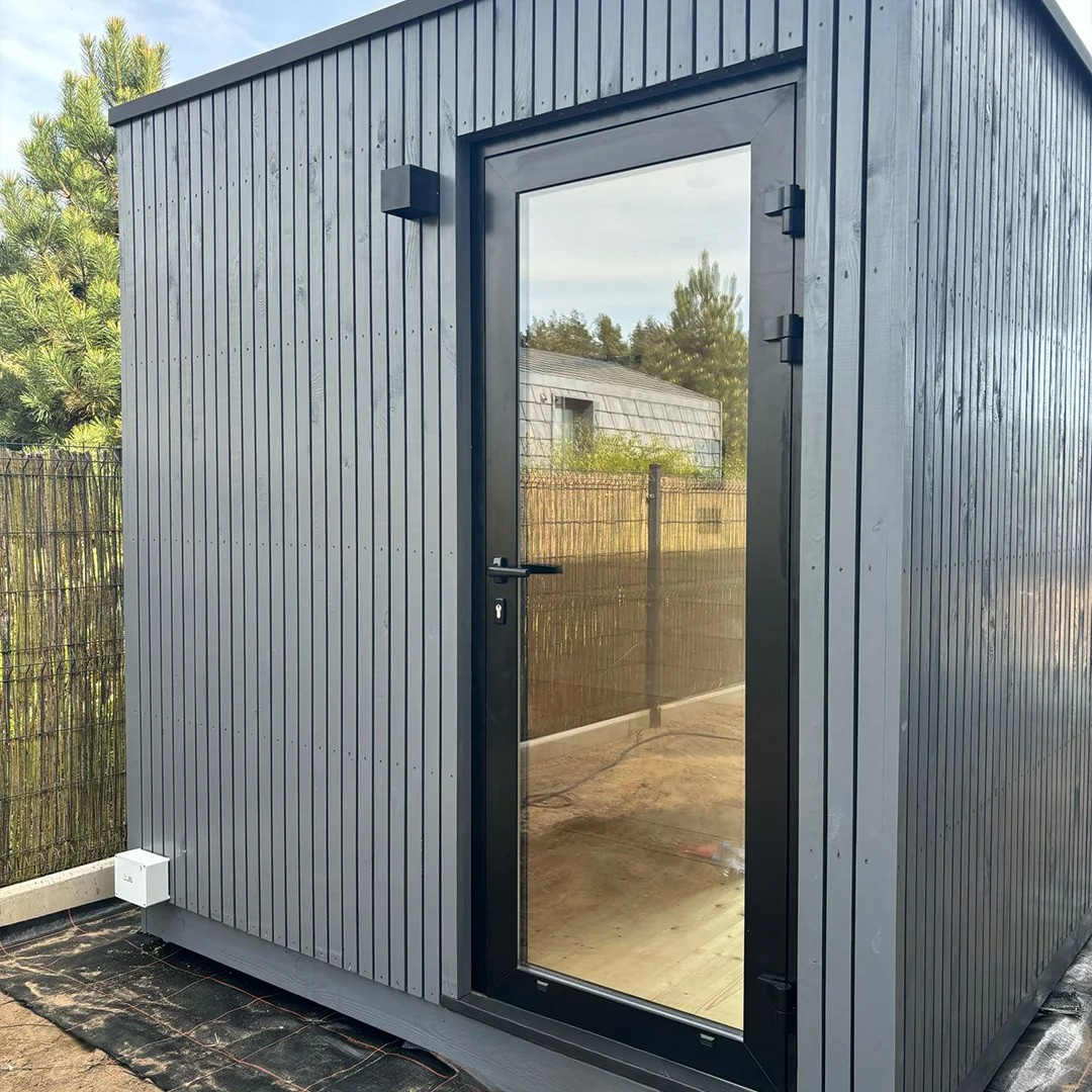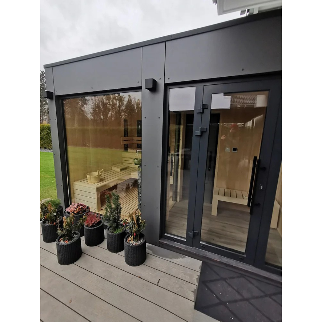 Das Gartenhaus HARA umfasst eine Sauna sowie einen Vorraum. Die Fassade besteht aus Brettern mit rechteckigem Profil und ist mit einem geeigneten Schutzöl behandelt. Das Flachdach ist mit einer PVC-Dachmembran gedeckt und mit einer Regenrinne zur Wasserableitung ausgestattet.
