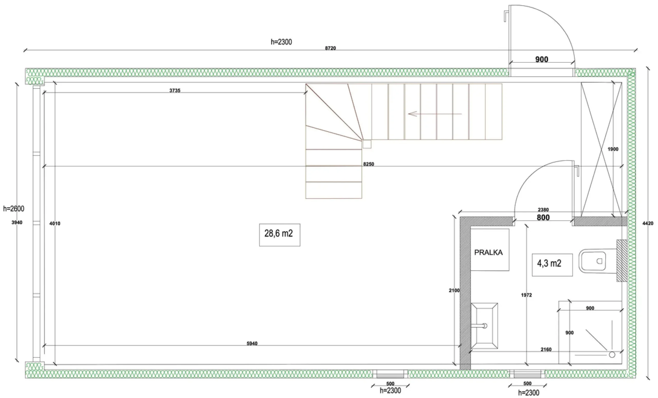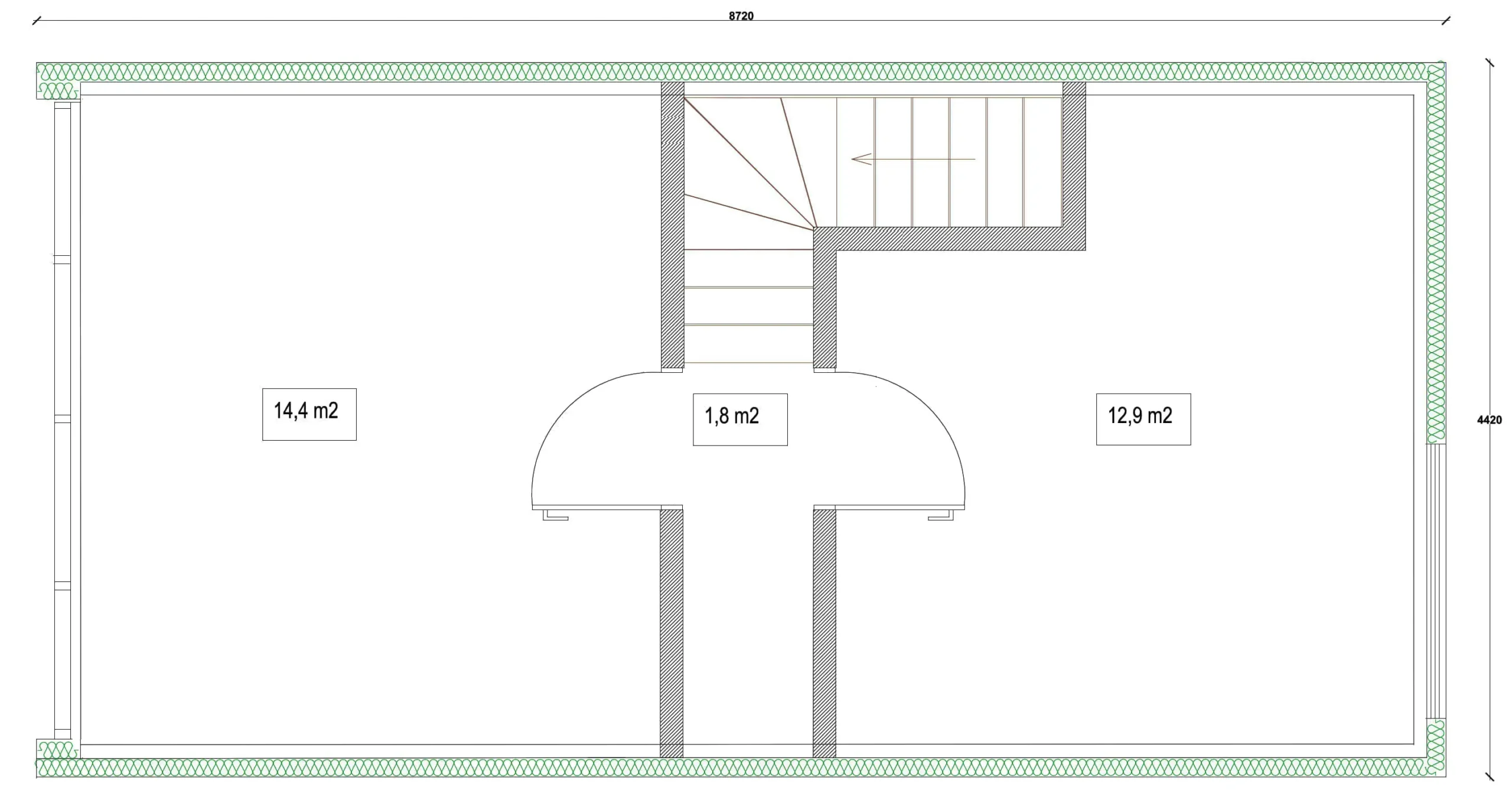 Abmessungen des Hauses: 4,42 m x 8,72 m