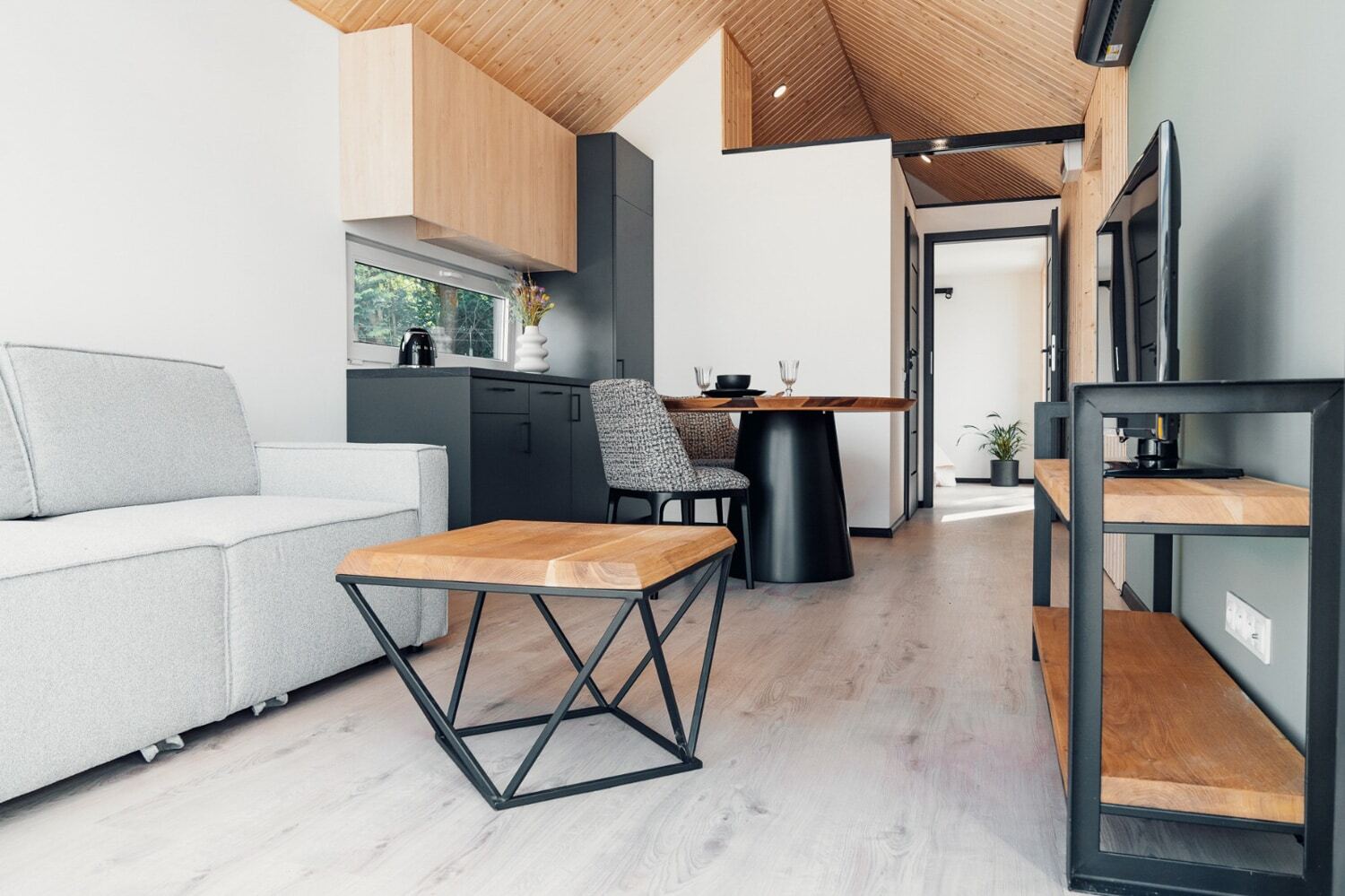 Einladend und gemütlich: Schlafsofa, stilvoller Couchtisch, passender TV-Tisch und eine Klimaanlage für angenehmes Raumklima.