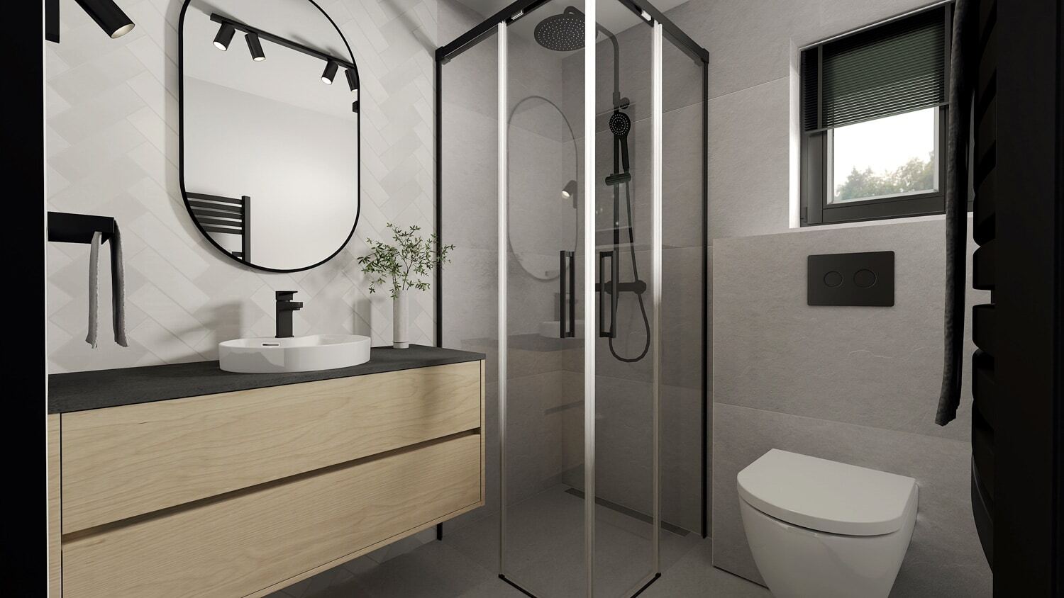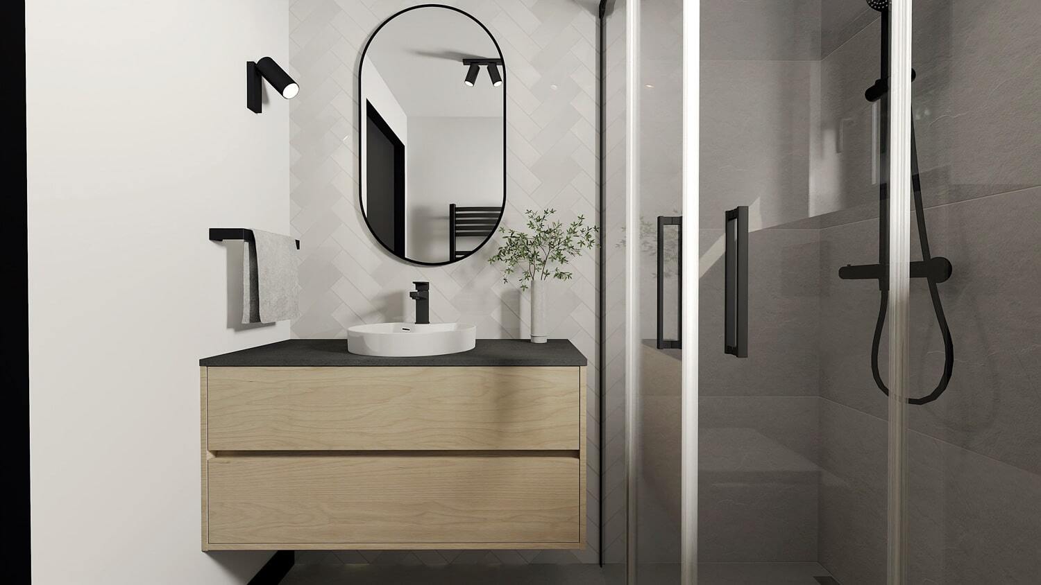Komplett ausgestattet: Duschkabine (90 cm), Spiegel, Waschbecken mit Unterschrank, Handtuchheizkörper, 80-Liter-Boiler und eine Waschmaschine.