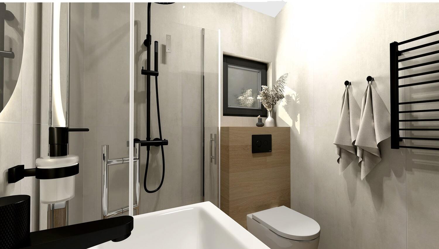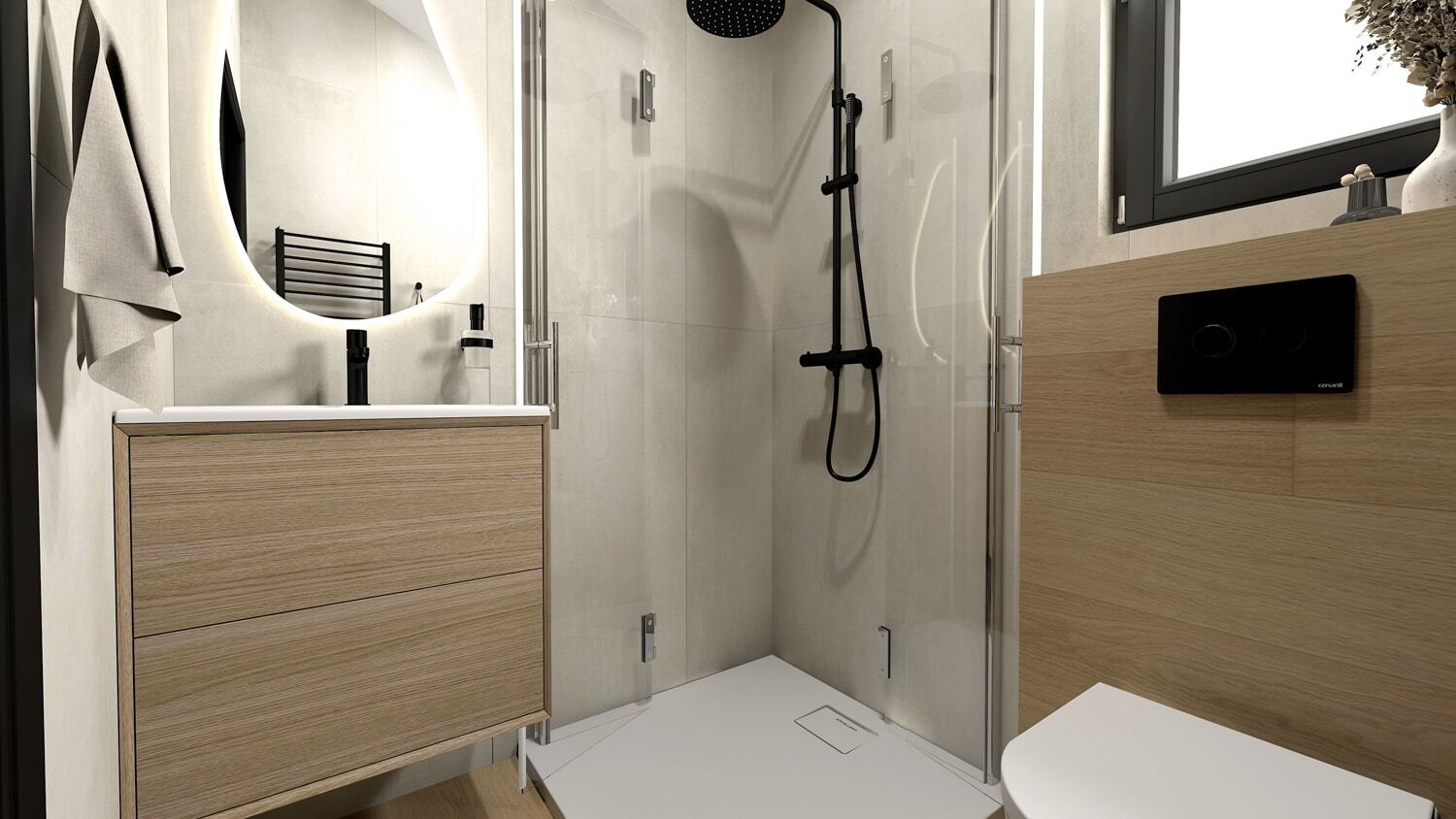Komplett ausgestattet: Duschkabine mit 80 cm, Spiegel, Wandschrank mit Waschbecken, Handtuchheizkörper, Kompakt-WC, 50-Liter-Boiler und eine Waschmaschine.