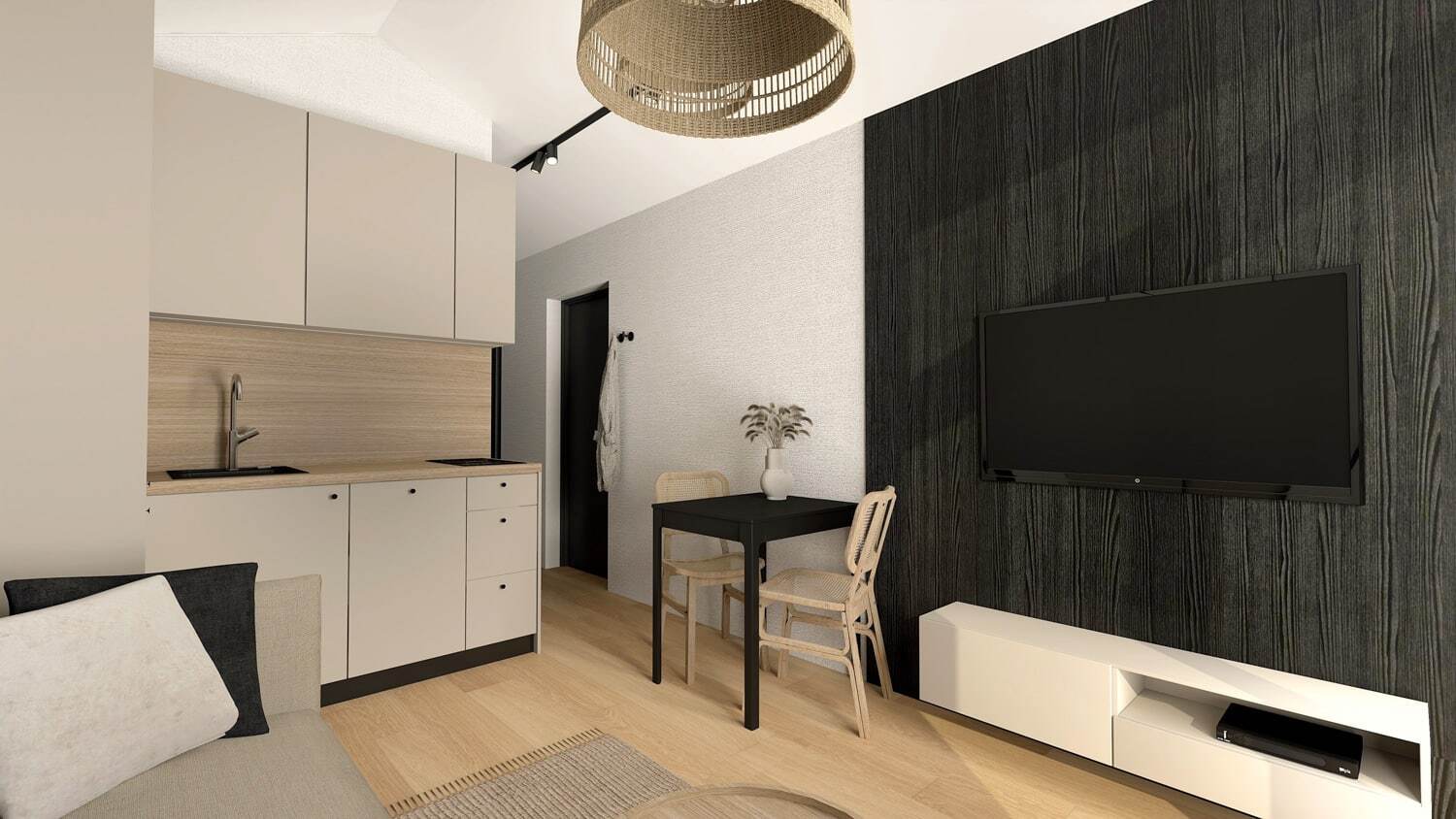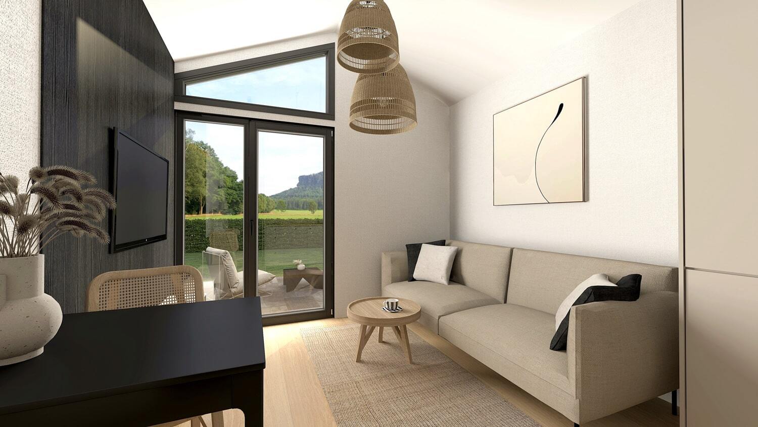 Komfort und Stil: Sofa mit Schlaffunktion, ein eleganter Couchtisch, ein passender TV-Tisch und eine Klimaanlage für perfekte Raumtemperatur.