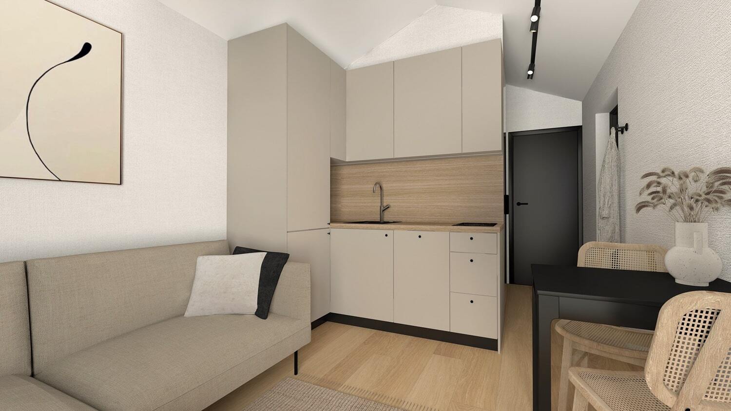 Modern und funktional: Küchenmöbel, 2-Flammen-Induktionskochfeld, Kühlschrank, Spüle, Geschirrspüler und Backofen. Wir verwenden ausschließlich hochwertige Elektrogeräte von Siemens, alternativ auch Bosch, falls gewünscht.