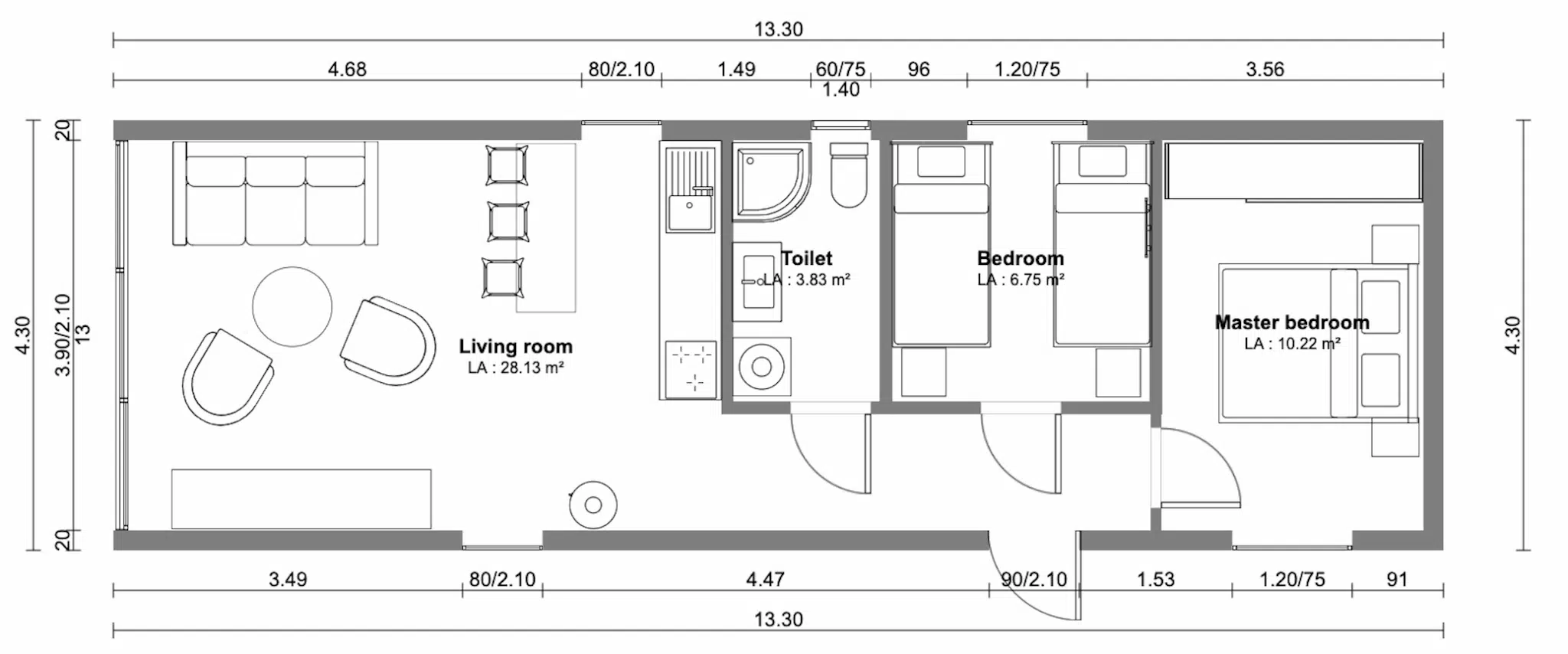 Abmessungen des Hauses: 4,30 m x 13,30 m