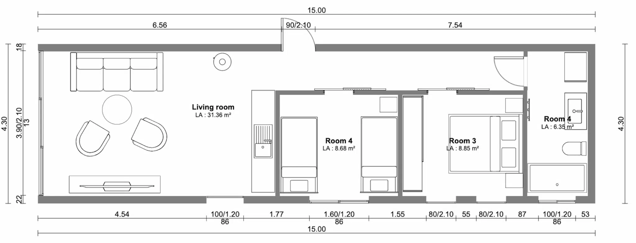 Abmessungen des Hauses: 4,30 m x 15,00 m