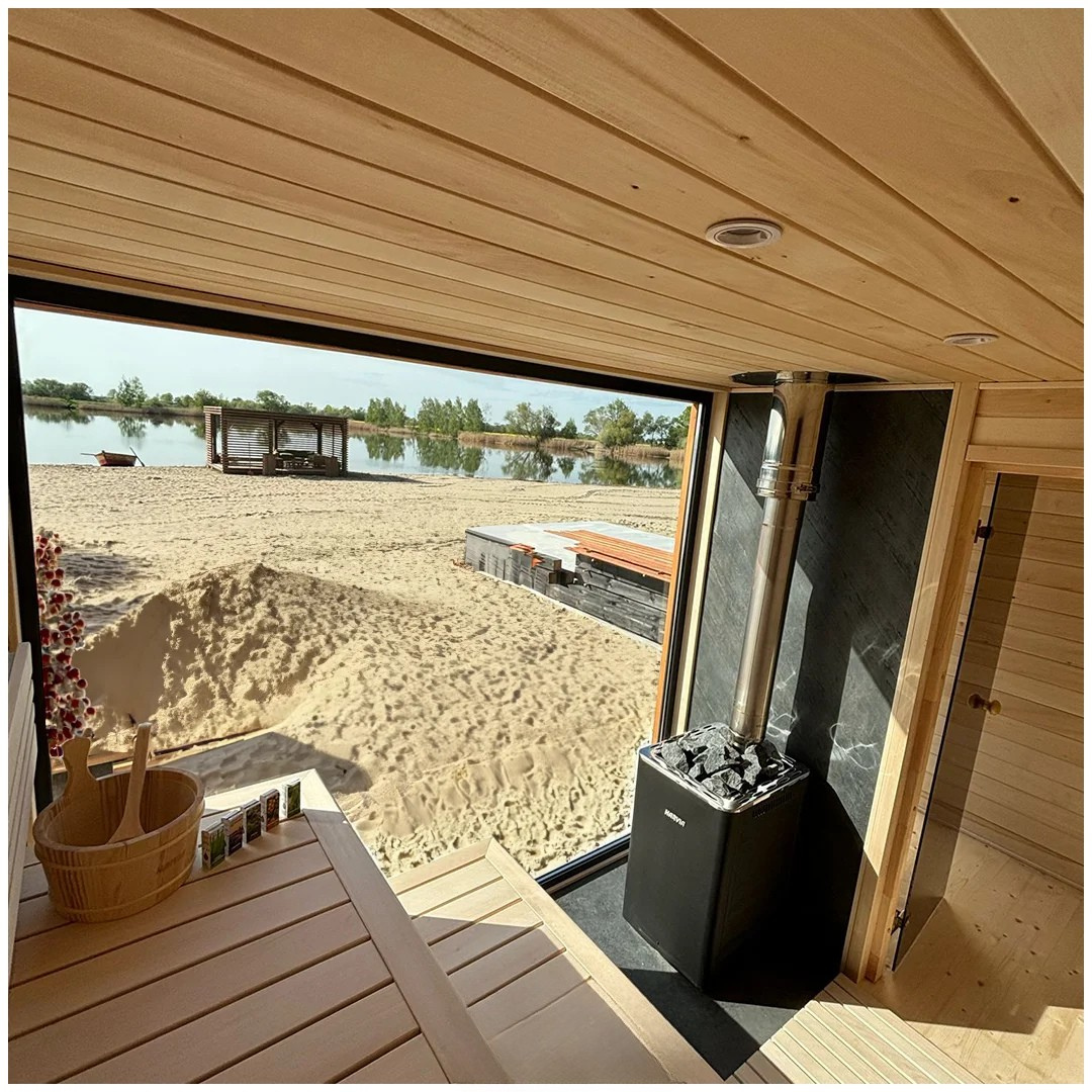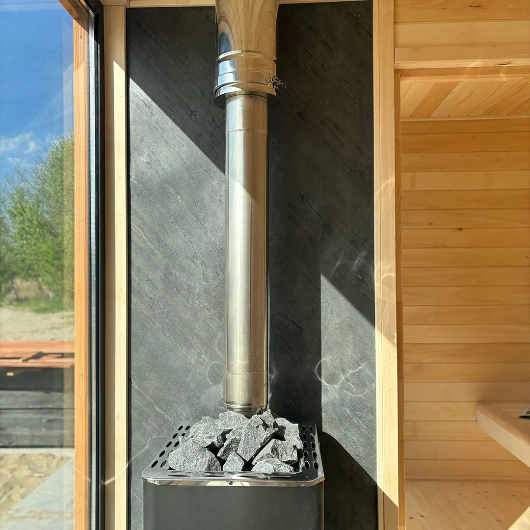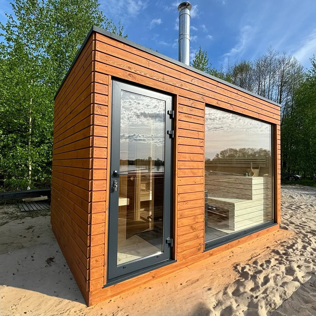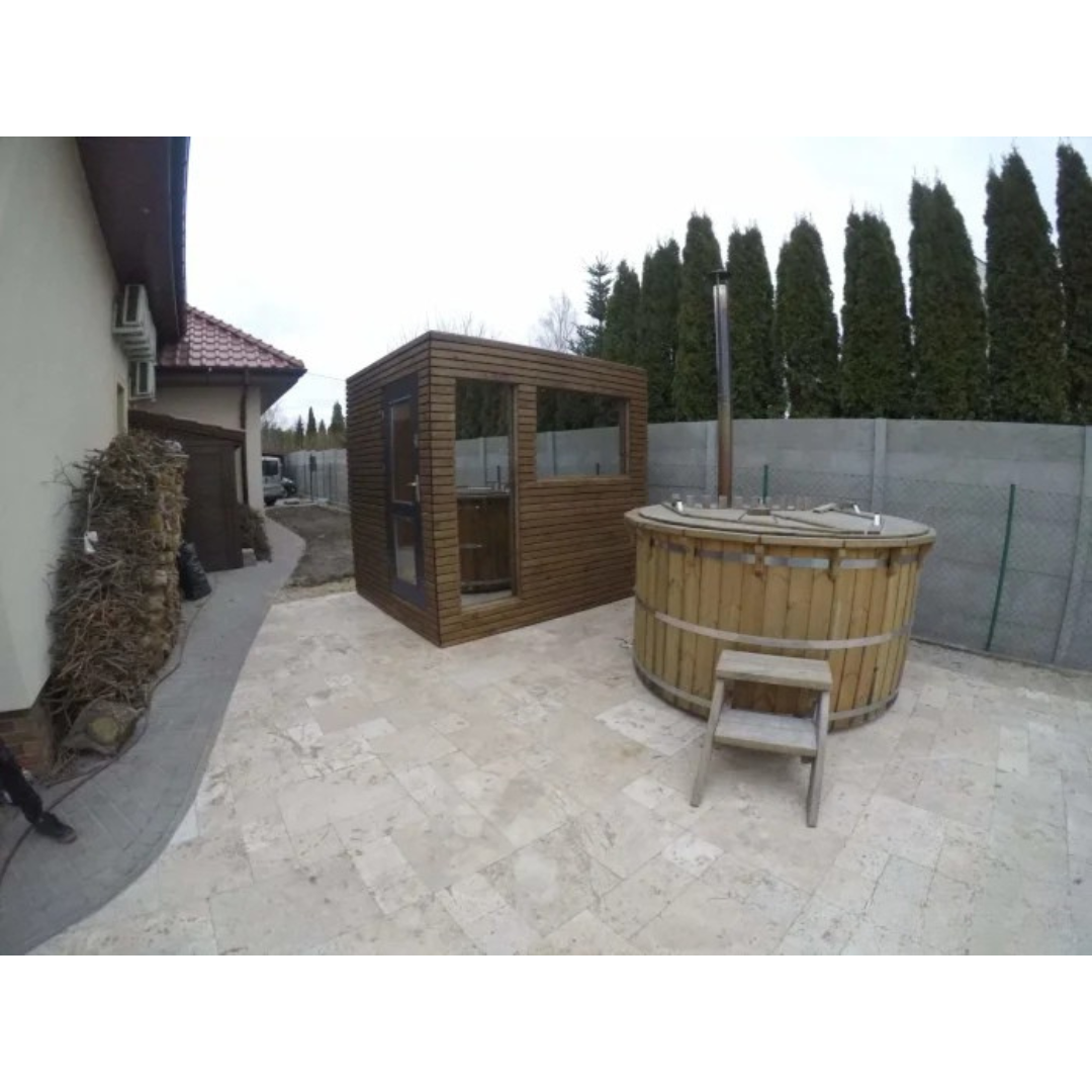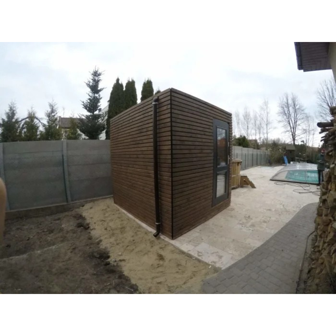 Die Außensauna verfügt über eine Außenfassade aus Fassadenbrettern mit ROMB-Profil. Das Dach ist mit einer PVC-Dachmembran gedeckt und mit einer Regenrinne ausgestattet. Die Isolierung besteht aus 100 mm starker Mineralwolle sowie zwei Folien: einer dampfdurchlässigen Membran und einer Dampfsperrfolie.