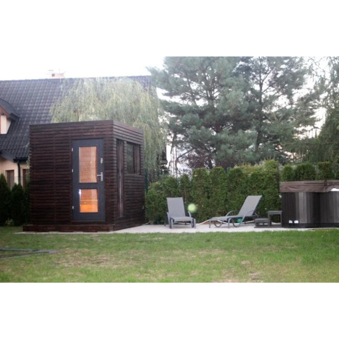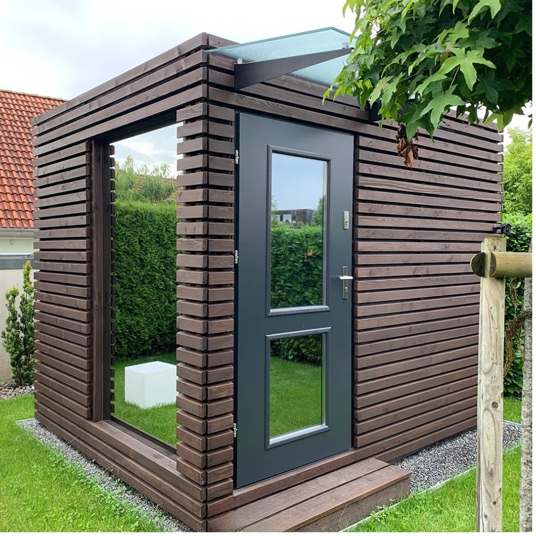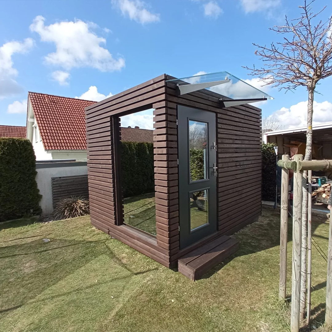 Darüber hinaus ist die Gartensauna mit moderner LED-Beleuchtung in Form von Einbauspots ausgestattet. Die Außenfassade wird durch zwei stilvolle Wandleuchten beleuchtet.
