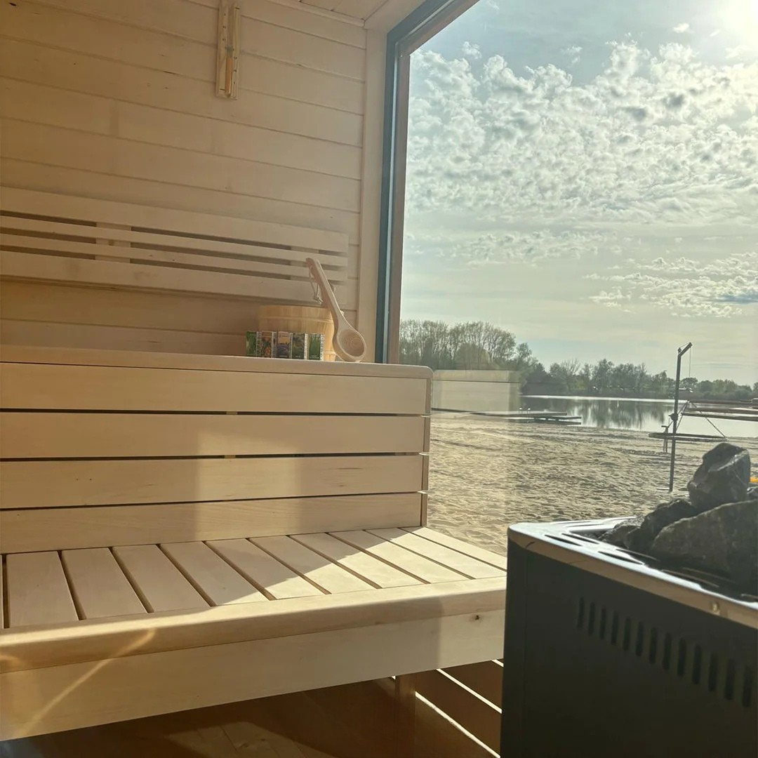 Ein doppelt verglastes Fenster im Vorraum verleiht dem Saunahaus zusätzlichen Charme. Die Wände und die Decke im Vorraum sind mit Fichtenschalung verkleidet.