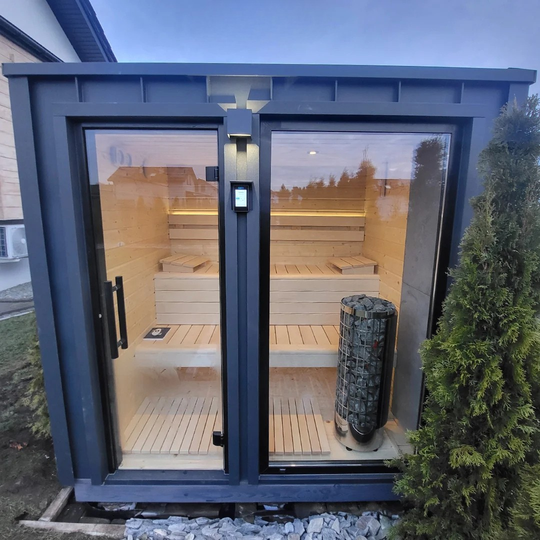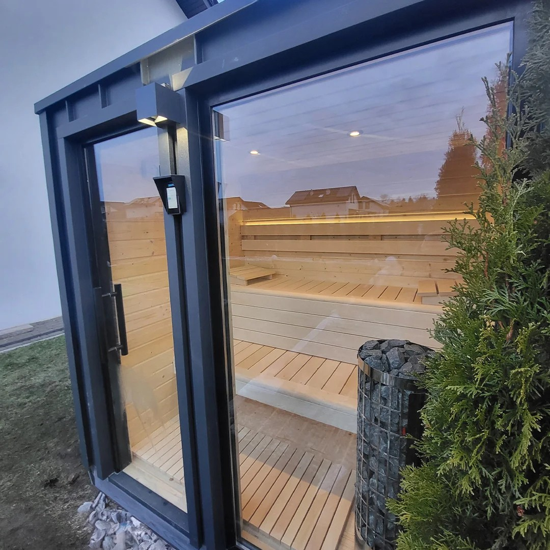 Im Innenraum befinden sich ein Holzboden sowie ein Holzpodest. Die Wandverkleidung in der Sauna besteht aus skandinavischem Fichtenholz. Zur Grundausstattung gehört auch eine stilvolle LED-Beleuchtung in Form von Einbauspots.