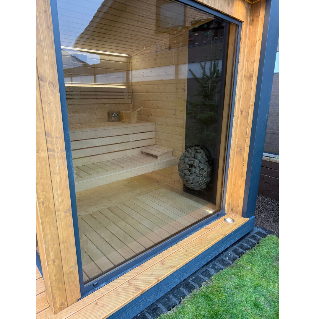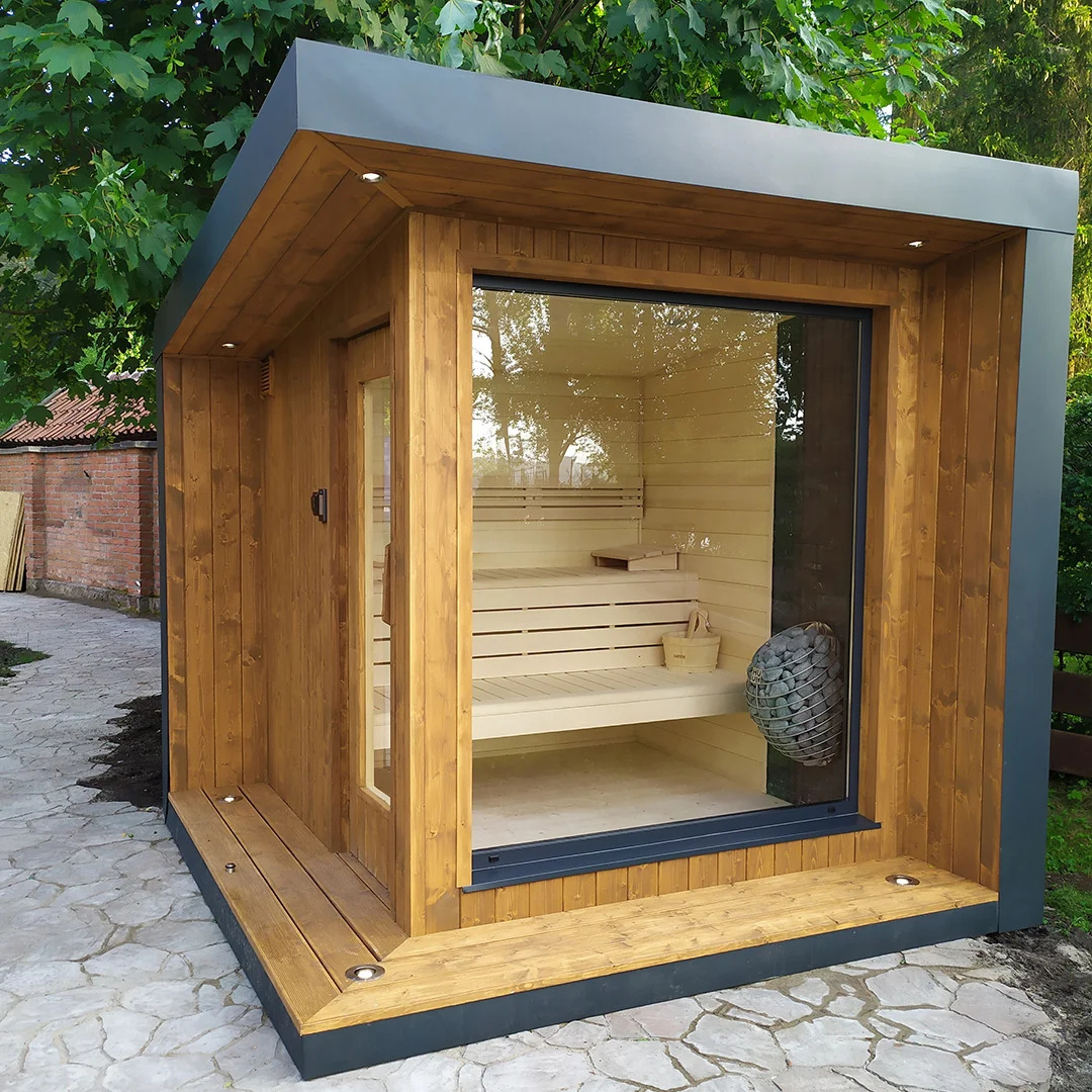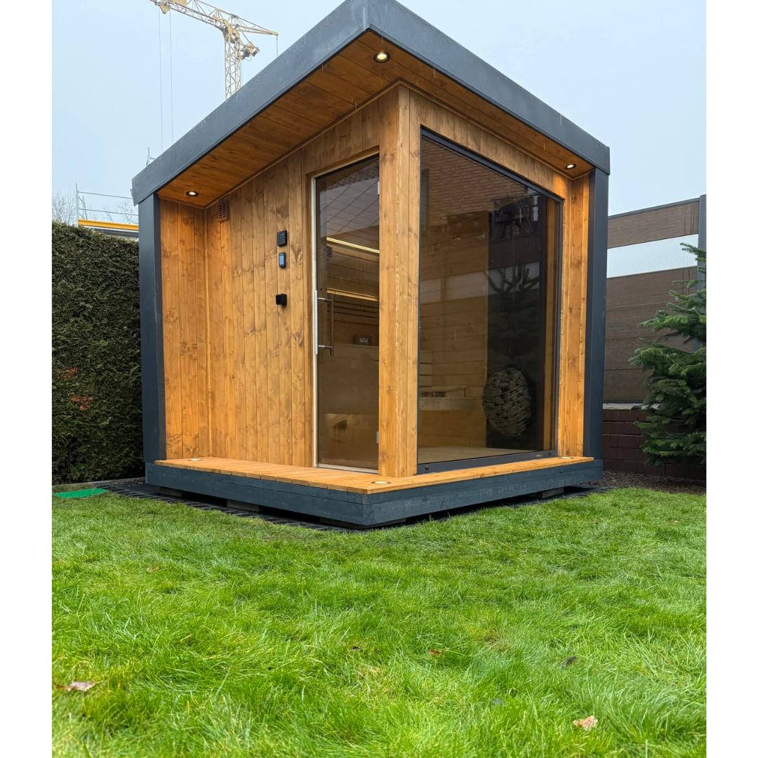 Die Fassade der Gartensauna TULA vereint Holz und Metall zu einer modernen, stilvollen Einheit. Dank ihrer kompakten Form eignet sich die Sauna sowohl für private Gärten als auch für größere Ferienanlagen.