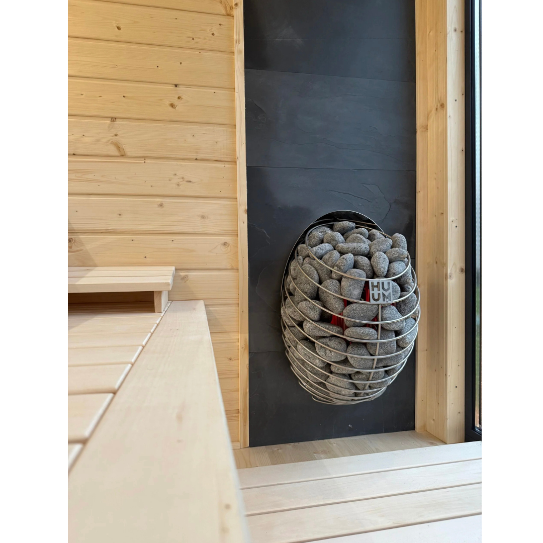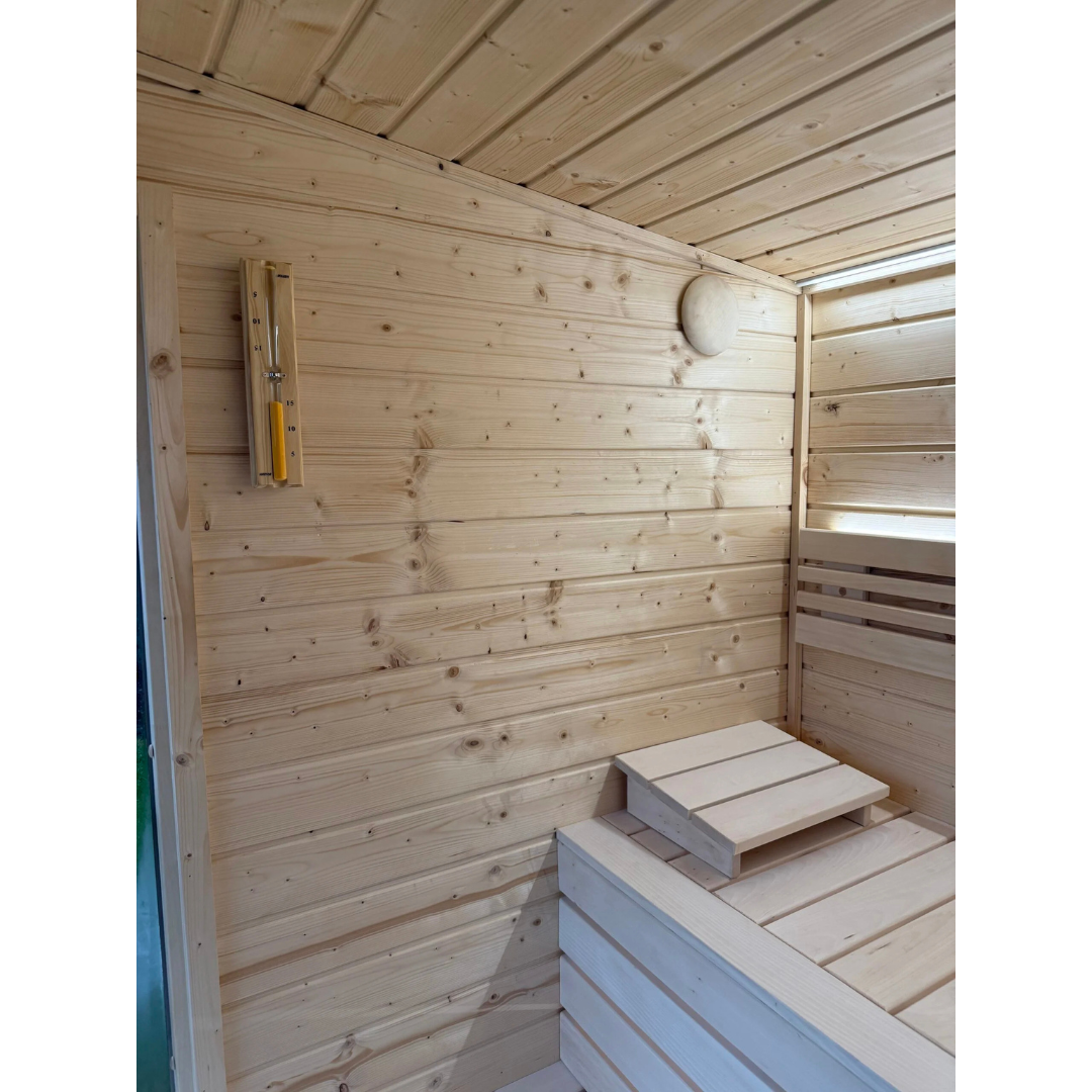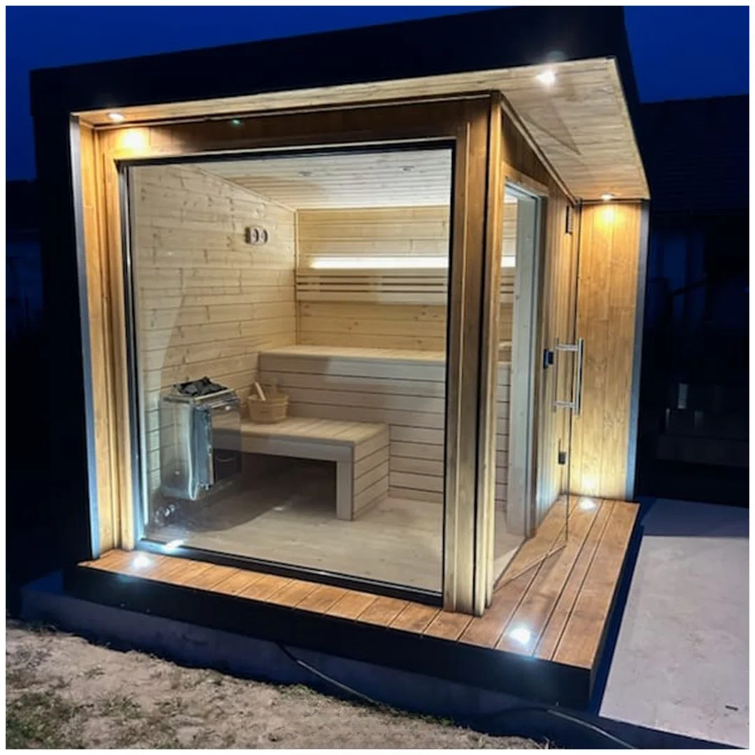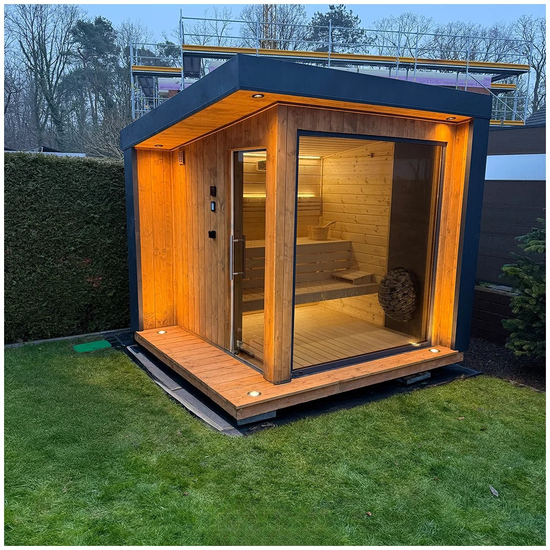 Farbe der Fassade, Ausstattung sowie die Anordnung der Bänke können individuell angepasst werden. In der klassischen Ausführung ist die Holzverkleidung mit einer Schutzlasur im Farbton „Goldene Eiche“ gestrichen. Ebenso ansprechend wirkt die Sauna mit astfreier Kiefer oder in elegantem Schwarz.