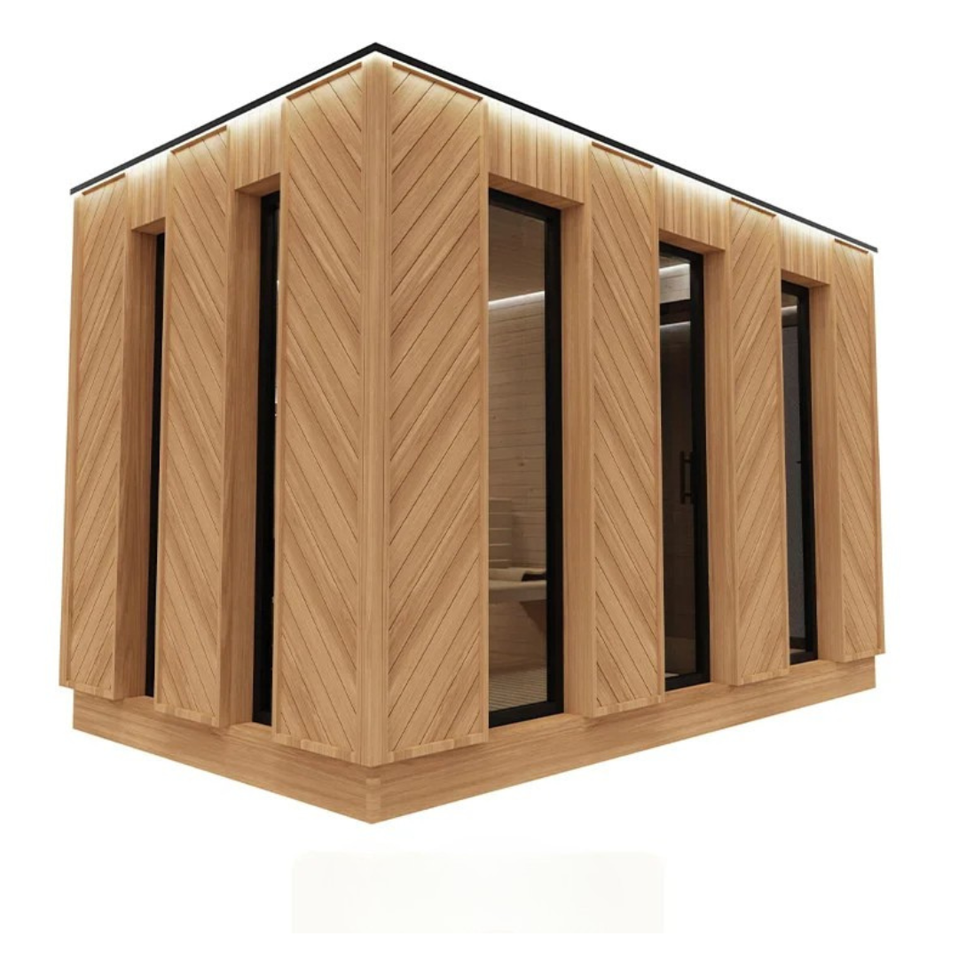Die Gartensauna ZAVA ist eine Kombination aus modernem und skandinavischem Stil. Ihre Fassade ist mit Fischgrätpaneelen in einem hellen Holzton verkleidet.