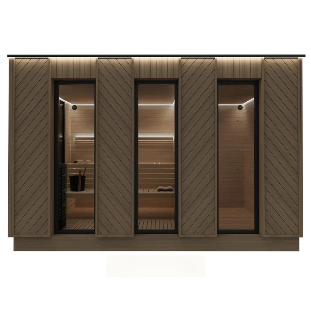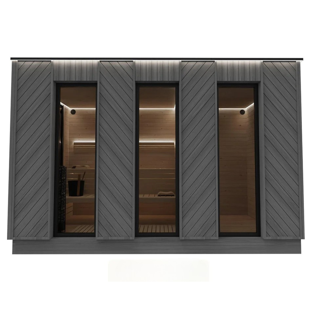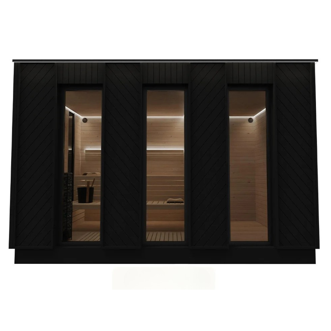 Die schlichte Form des Gebäudes wird durch Verglasungen in Form schmaler Fenster mit getönten Scheiben aufgelockert. Das Innere umfasst eine finnische Sauna sowie einen Vorraum, der optional mit einer Dusche ausgestattet werden kann.