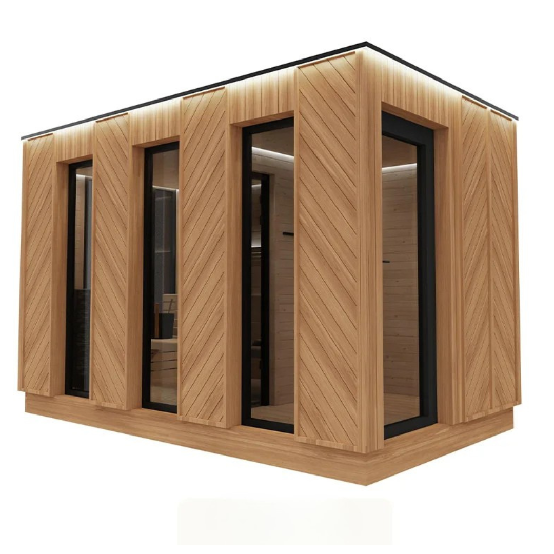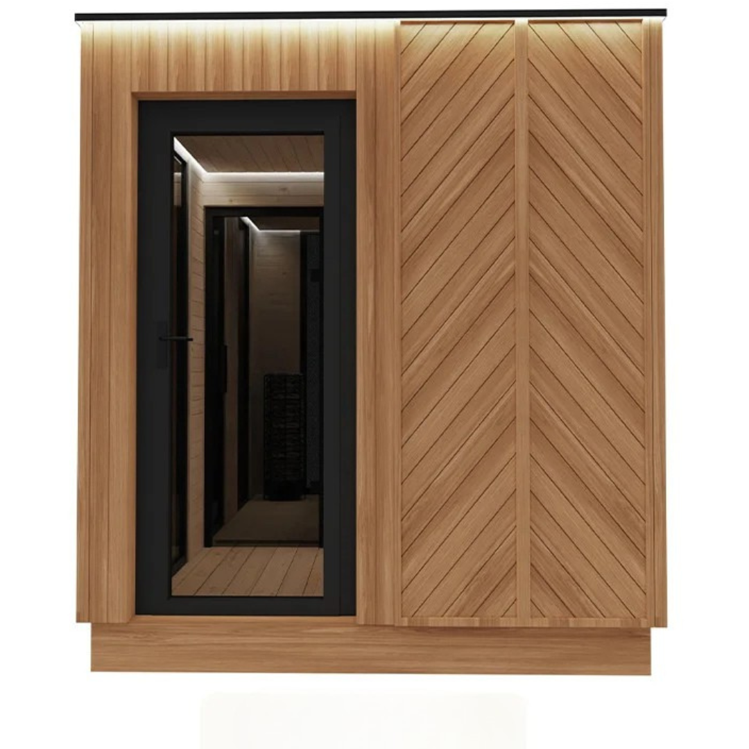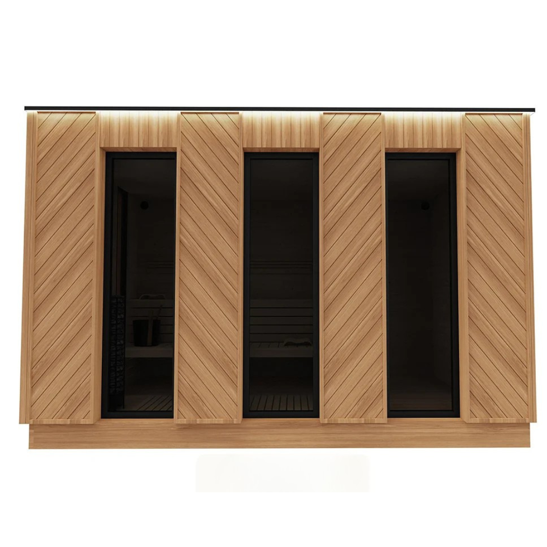 Die schlichte Form des Gebäudes wird durch Verglasungen in Form schmaler Fenster mit getönten Scheiben aufgelockert. Das Innere umfasst eine finnische Sauna sowie einen Vorraum, der optional mit einer Dusche ausgestattet werden kann.
